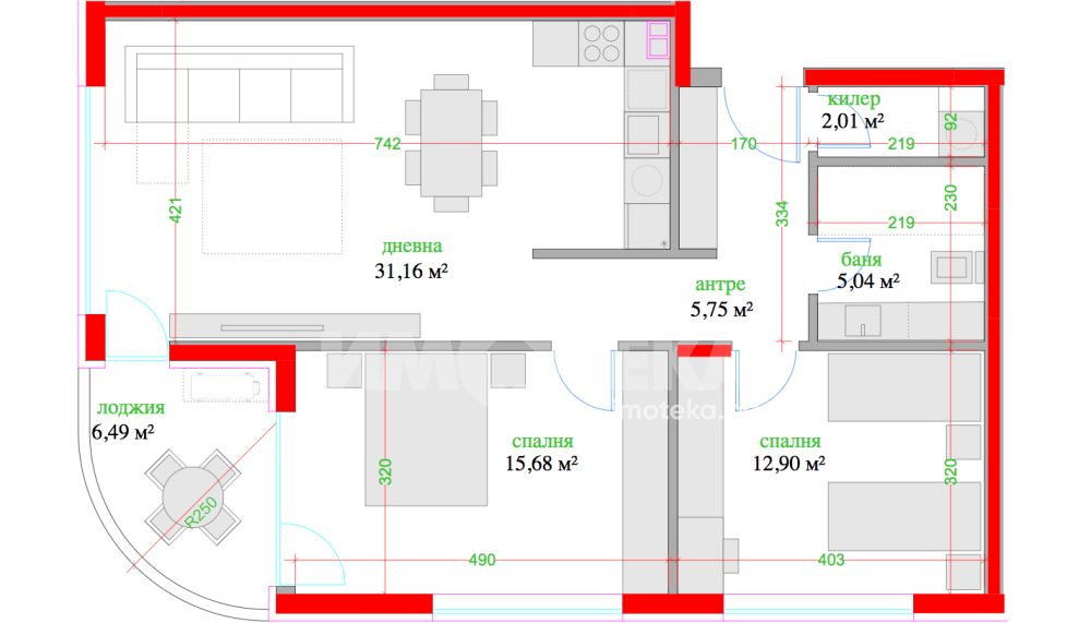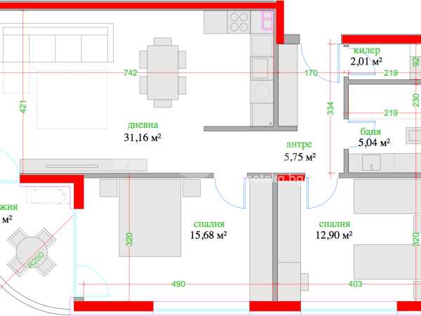 Състои се от просторна дневна с кухненски бокс с площ 32 кв м, спалня 13 кв м, голяма детска стая 16 м2, антре, баня с тоалет, килер и тераса лоджия. Кристално пречистената минерална вода осигурява жилището с питейна минерална вода и гореща вода за кухня и баня.  Жилището е завършено до ключ - направени настилки, ефектно декорирани стени и тавани, оборудвана баня.