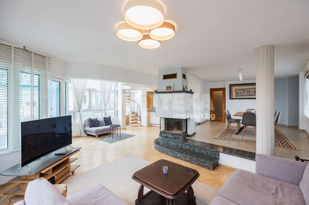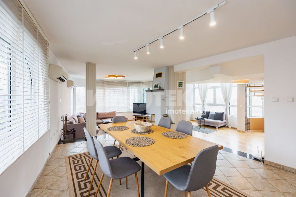 Предлагаме Ви панорамен, многостаен апартамент в Гръцката махала на метри от Морската градина. Апартаментът е разположен на 4ти и 5ти етаж в тухлена сграда с асансьор. Жилището е с площ от над 300 кв.м площ, разпределени в две нива: ПЪРВО НИВО се състои то: антре, огромна всекидневна с действаща камина и обособени кътове за релакс и хранене, излаз на просторна тераса с директна гледка към морето и парка; отделен кухненски бокс; баня с тоалет; отделен тоалет; гардеробно помещение и голяма стая. ВТОРО НИВО се състои от: първа голяма спалня със собствена баня с тоалет и излаз на панорамна тераса с изглед към морето и парка; втора голяма спалня, трета стая, оформена като голямо гардеробно помещение; баня с тоалет, отделен тоалет и перално помещение. Всяко ниво е с отделен вход от стълбищната клетка на сградата, а вътрешният достъп между нивата е посредством вита стълба. Апартаментът се отдава с наличното оборудване и обзавеждане. В наемната цена е включено паркомясто в подзмения гараж, . Отдава се дългосрочно, допускат се домашни любимци!