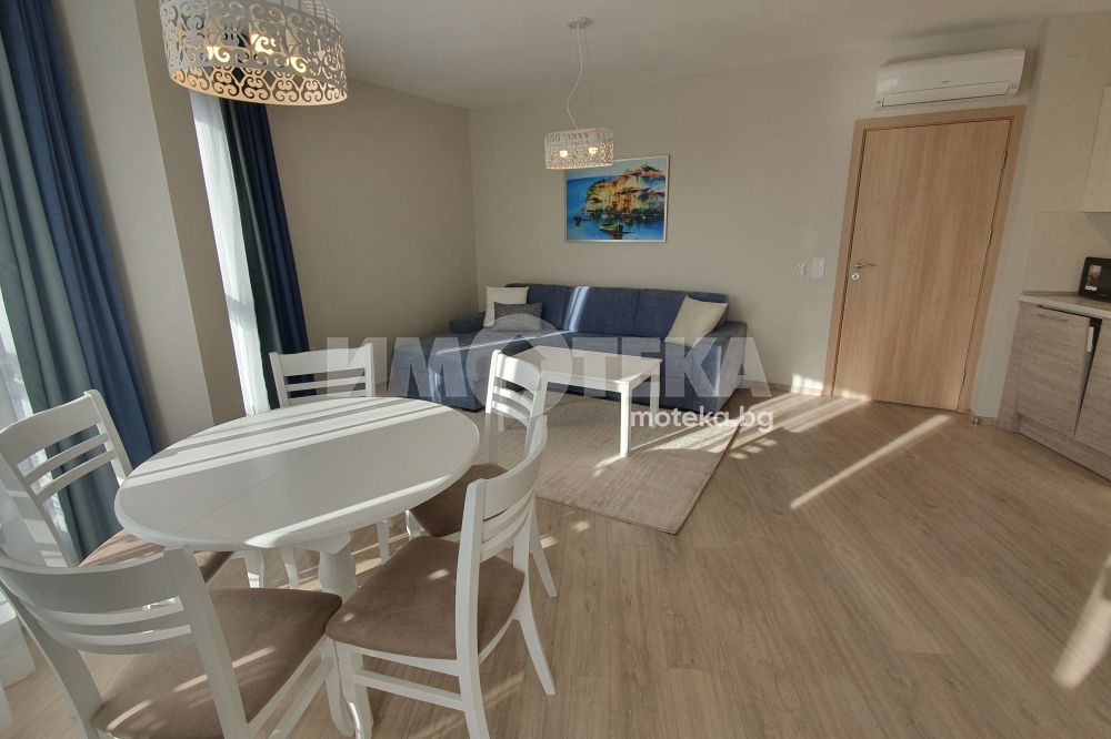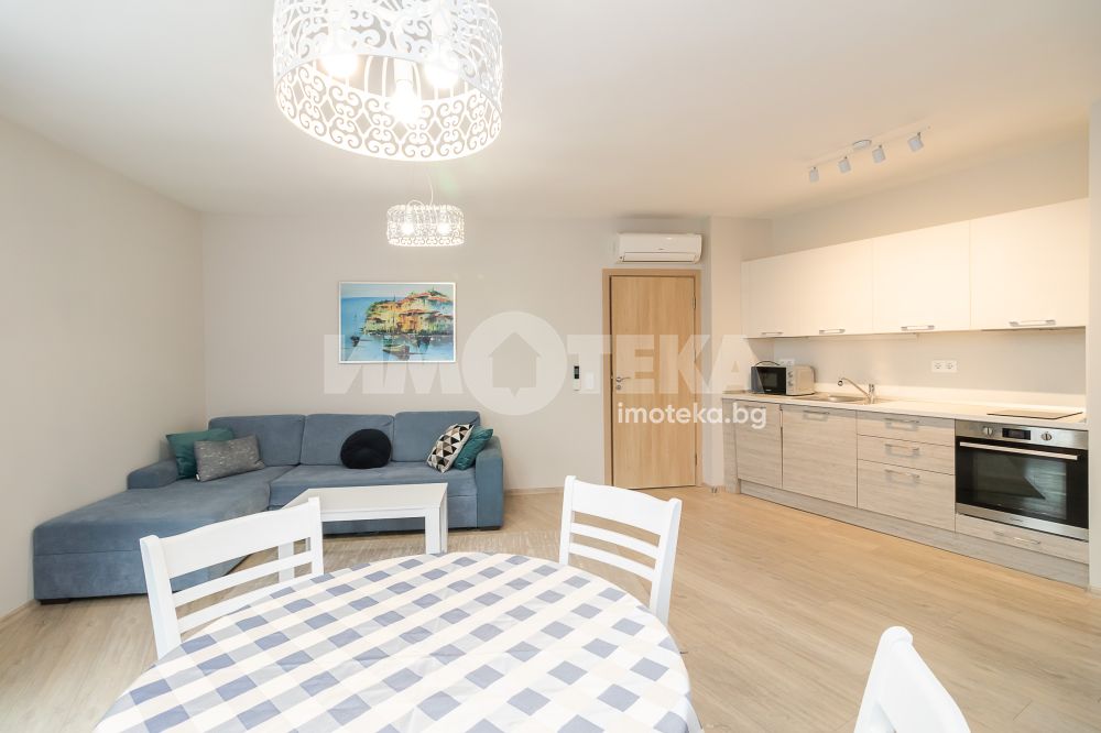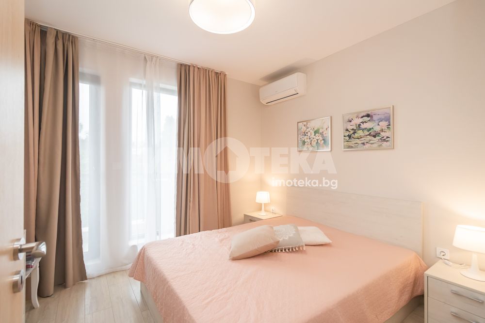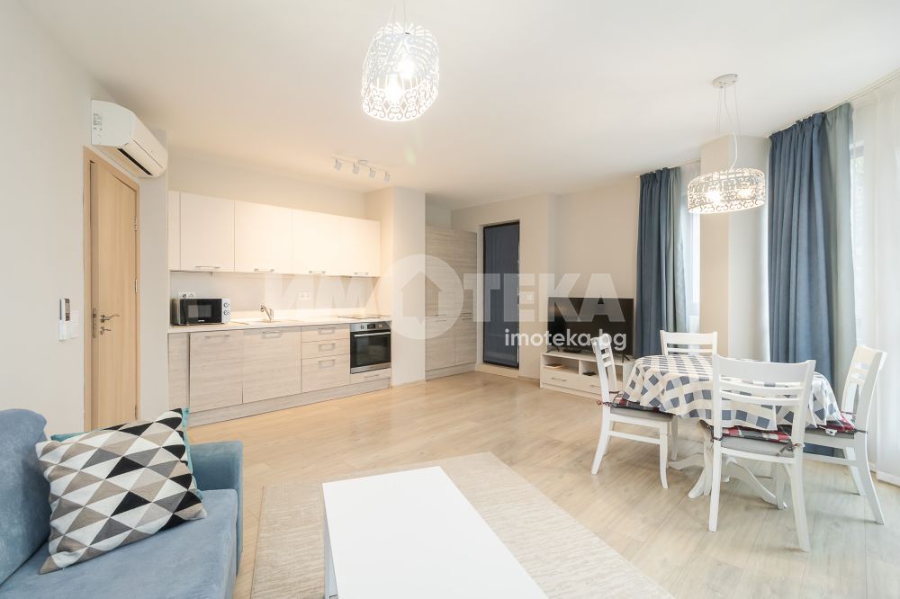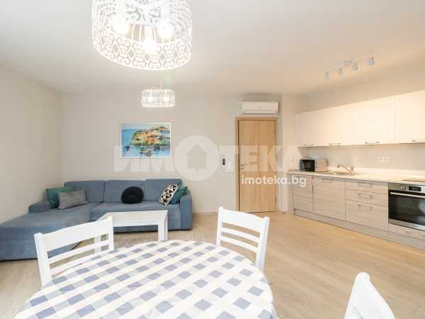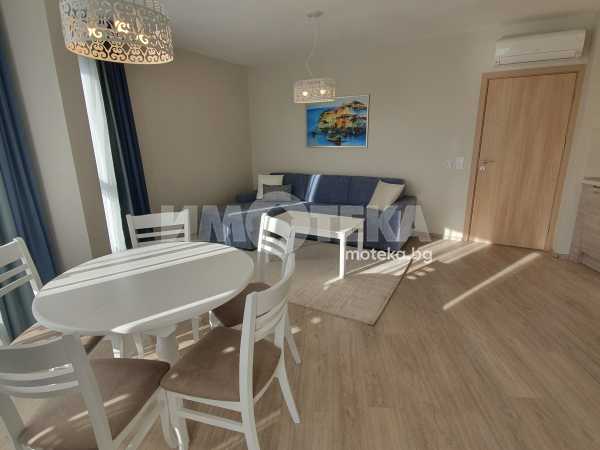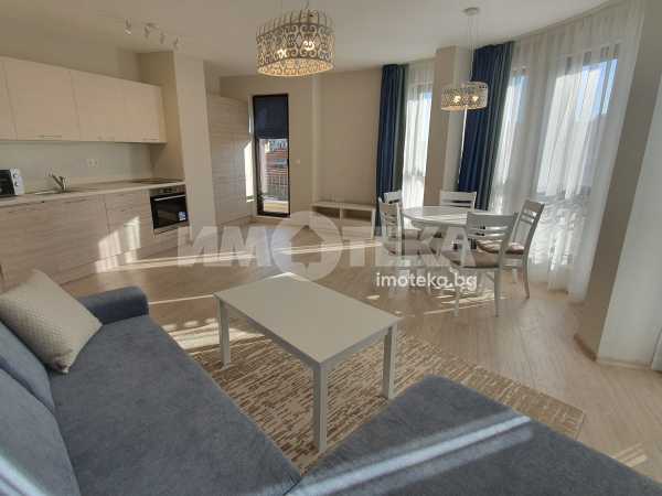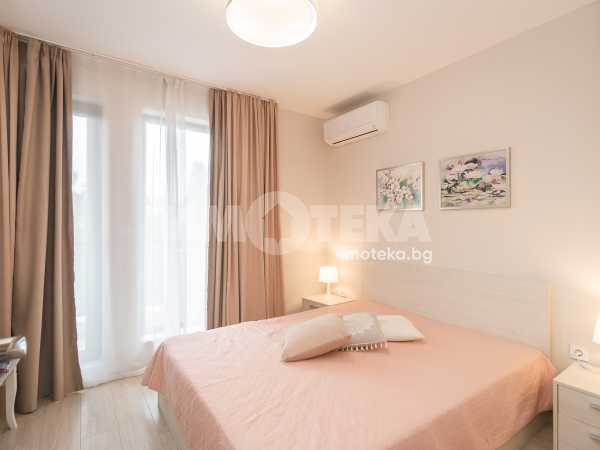 Състои се от слънчева и удобна дневна с вградена кухня , две спални (всяка от които с двойно легло, удобен гардероб, тоалетка), баня с тоалет и отделно още един санитарен възел, перално помещение, функционално входно антре.Имотът се отоплява с климатици от най-висок клас.