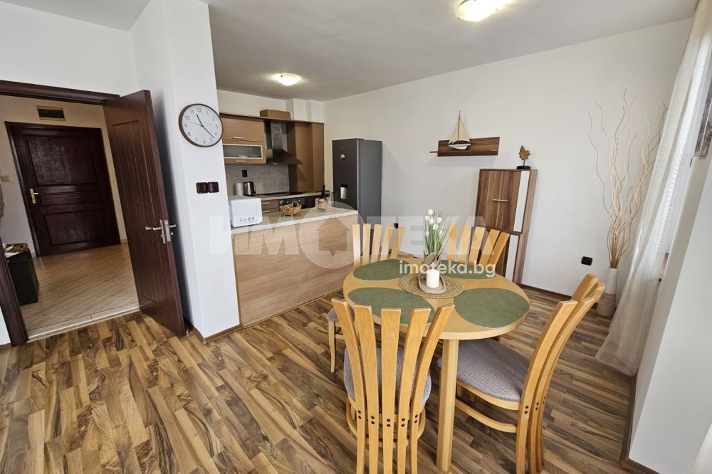 с кухненски бокс (има поставена сушилня за дрехи), две спални, баня /тоалет заедно, открита тераса с морска панирама. Отоплението и охлаждането е с климатик.
