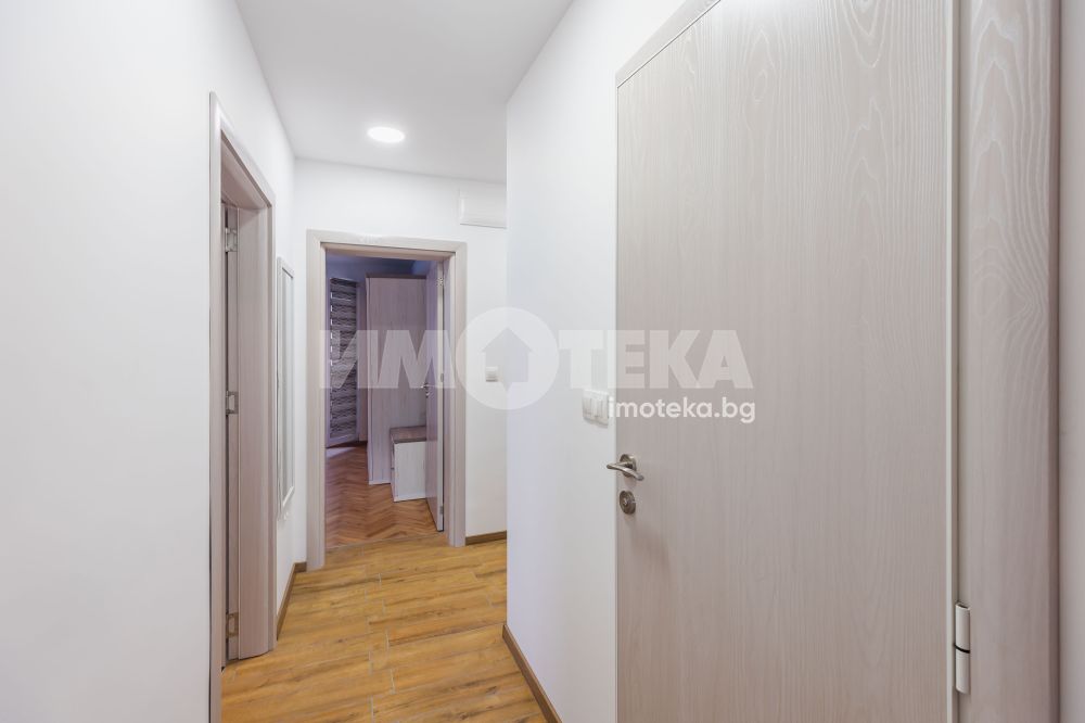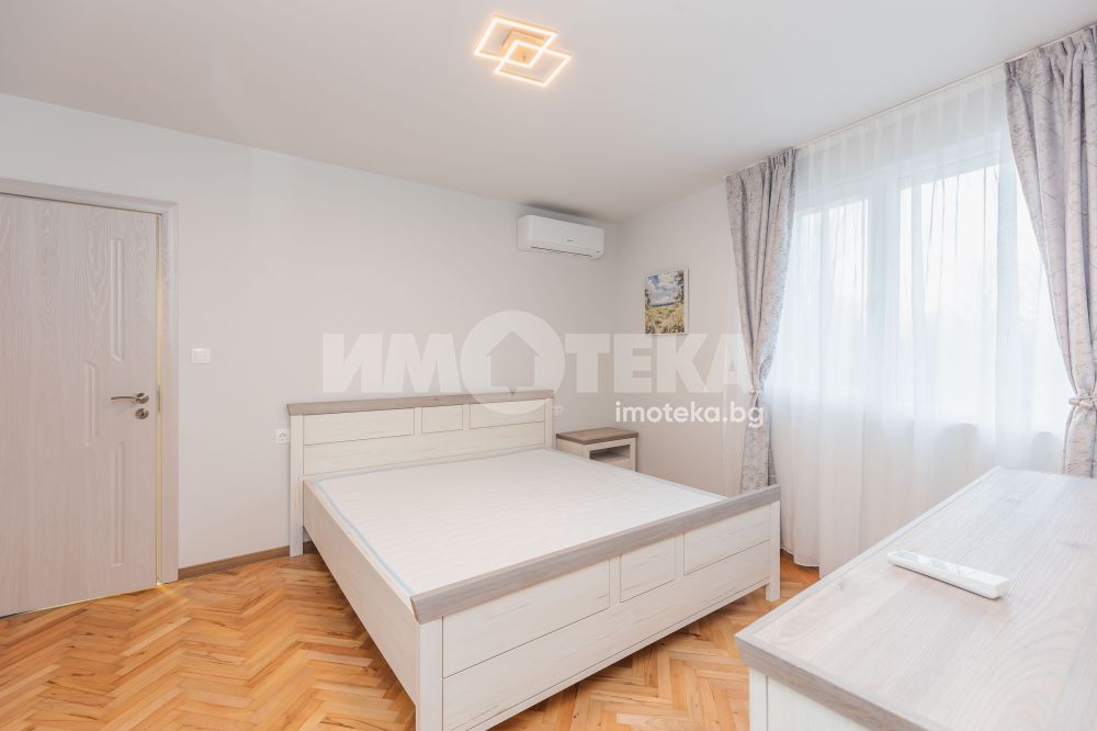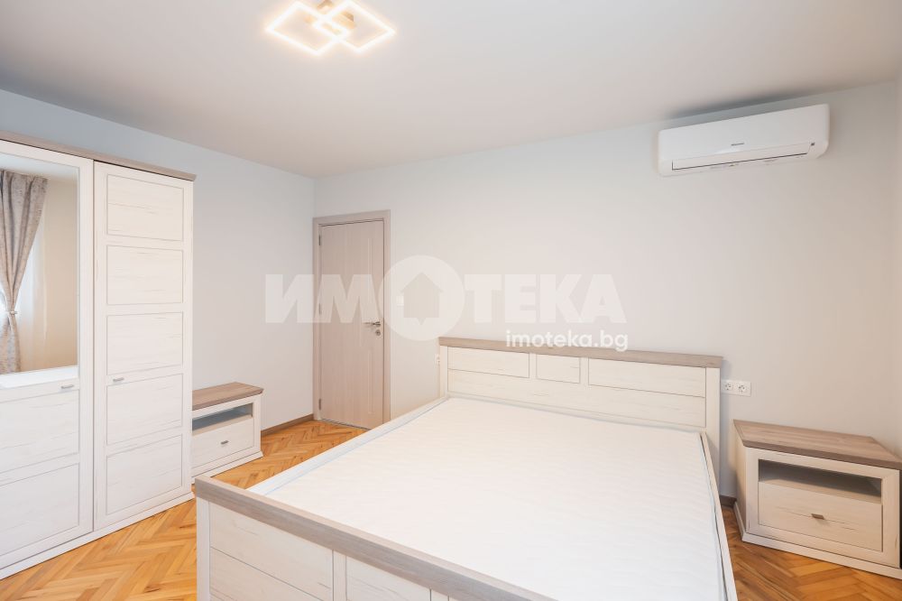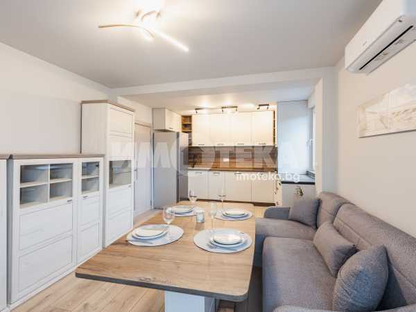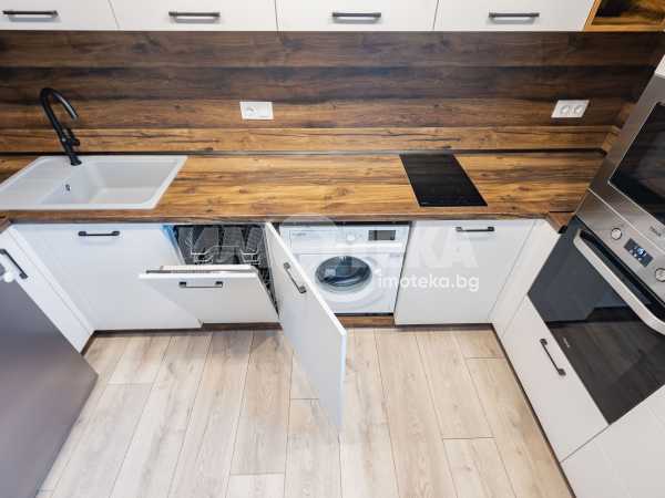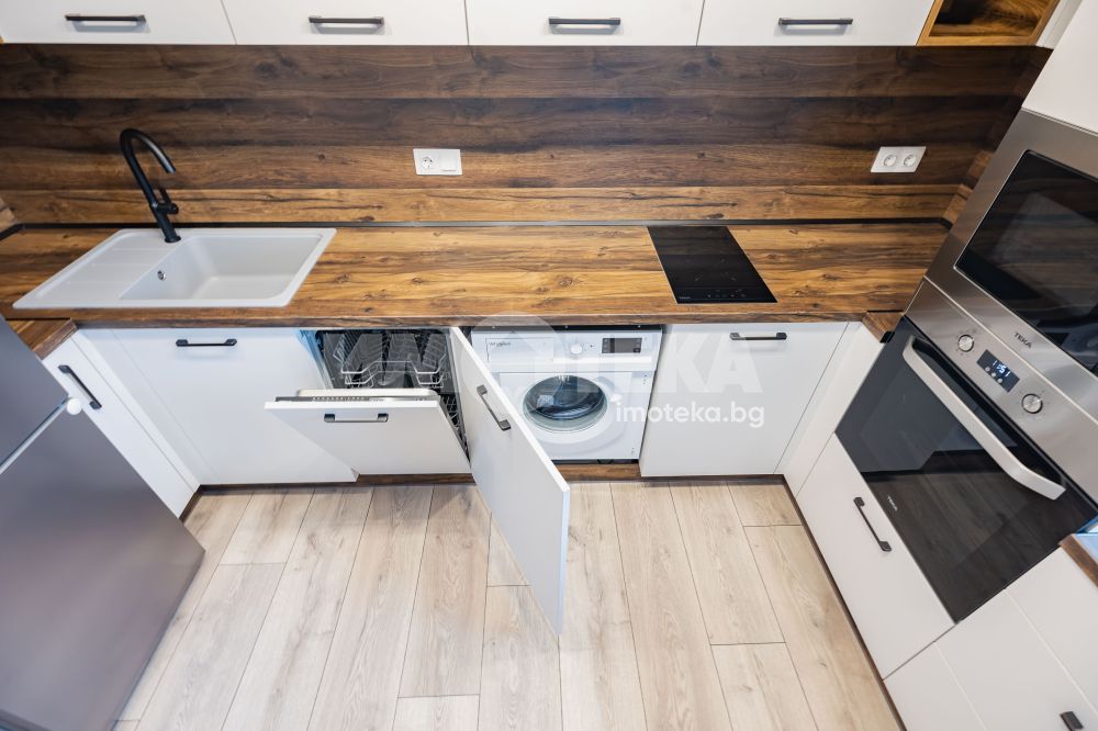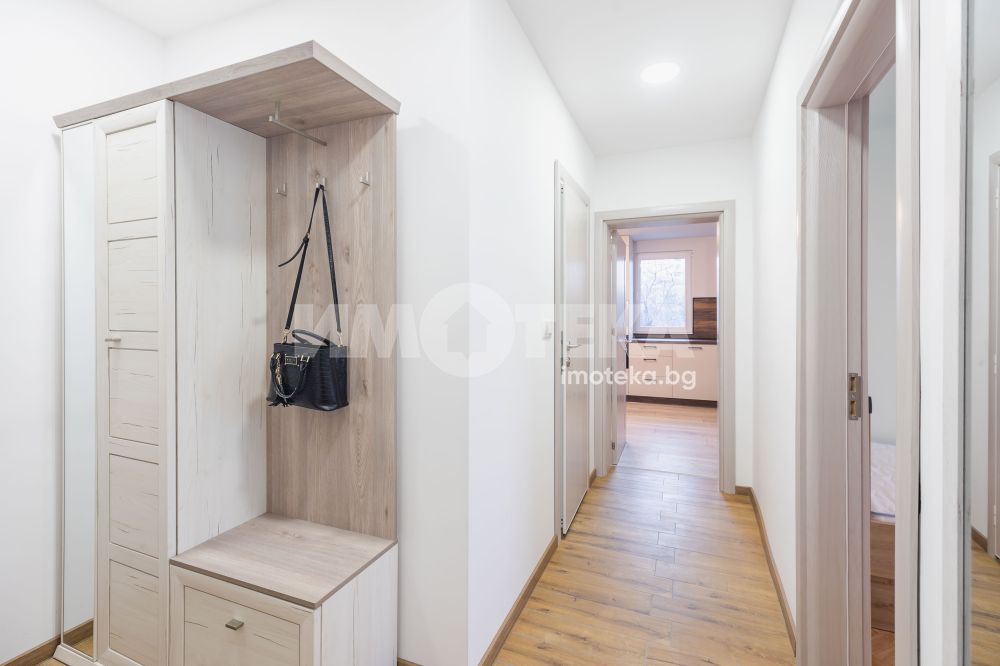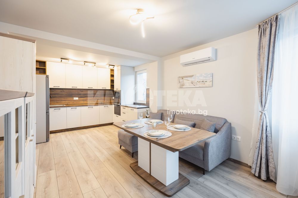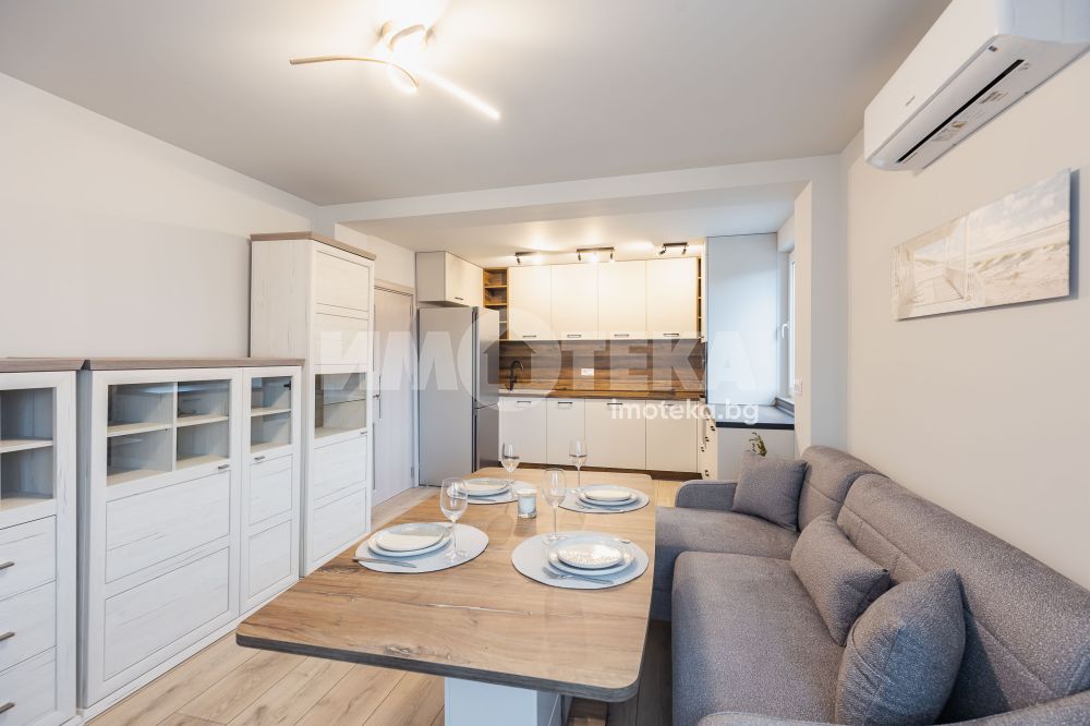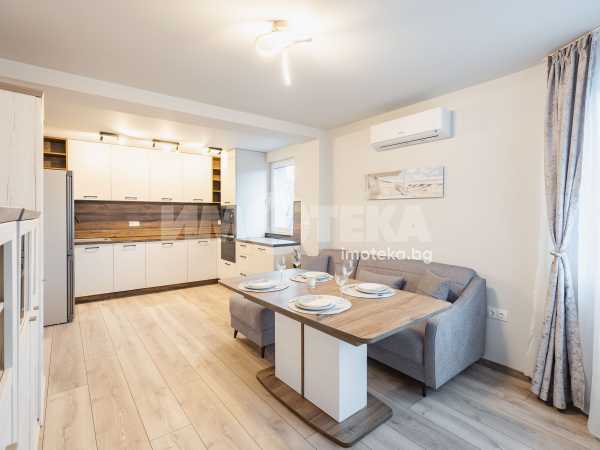 Предлагме Ви чисто, нов апартамент с две спални. Жилището е обзаведено в меки цветове, функционално разпределено. Представлява дневна с кухнеска част (бяла техника, вкл. съдомиялна, мека мебел). Спалня с голямо легло, гардероб, остъклена тераса. Втора спалня - обзаведена. Баня с тоалет. Три климатика. Първи наематели.