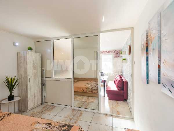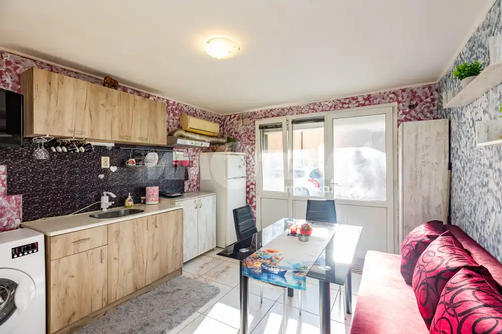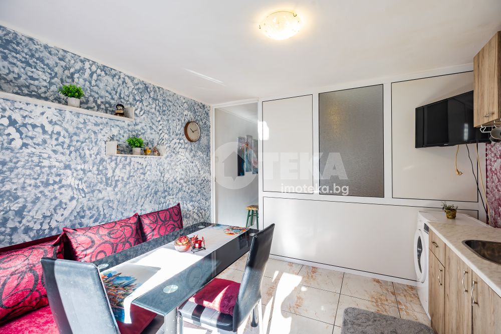 Само от Адрес недвижими имоти! Гараж преустроен на едностайно жилище, на партерен етаж, към улица, със застроена площ 27 кв.м и 4,44 кв.м. общи части. Състои се от едно помещение разделено на дневна, преходна спалня и баня с тоалет. Напълно обзаведено и готово за обитаване или отдаване под наем. Подходящо за инвалиди или трудноподвижни хора, с достъп от тиха улица, а така също за офис, фризьорски салон, кабинет и други дейности. Имотът е осигурен с ПВЦ дограма и ролетна щора с дистанционно. Огледите - с ключ.