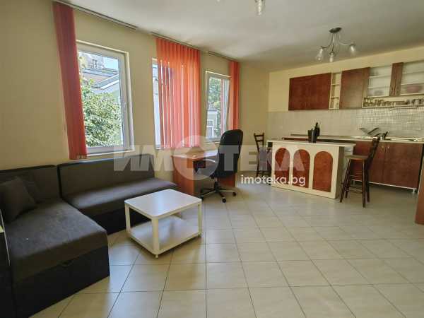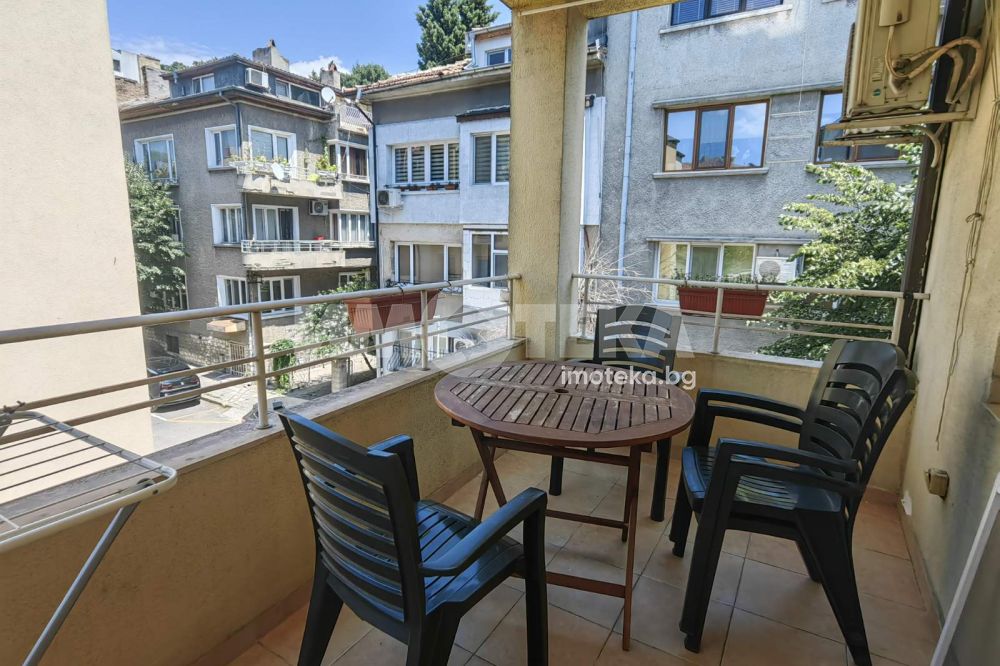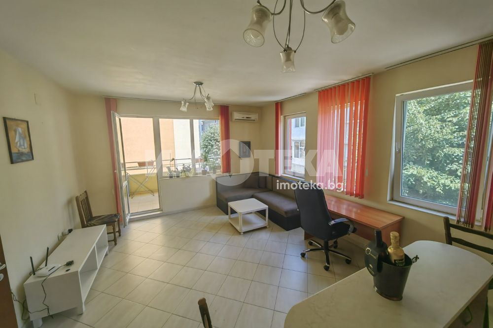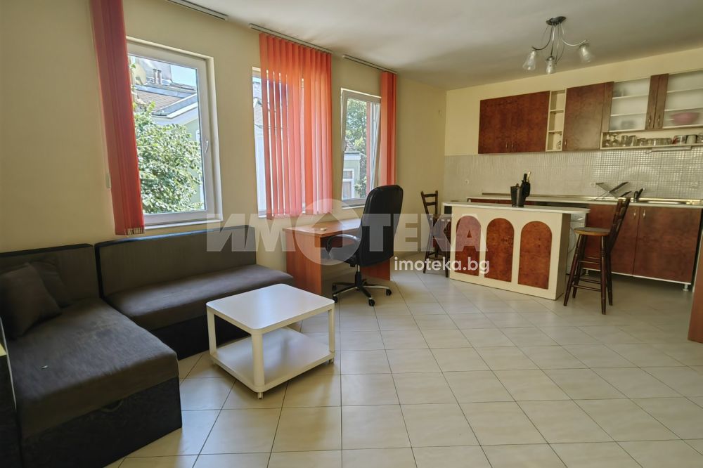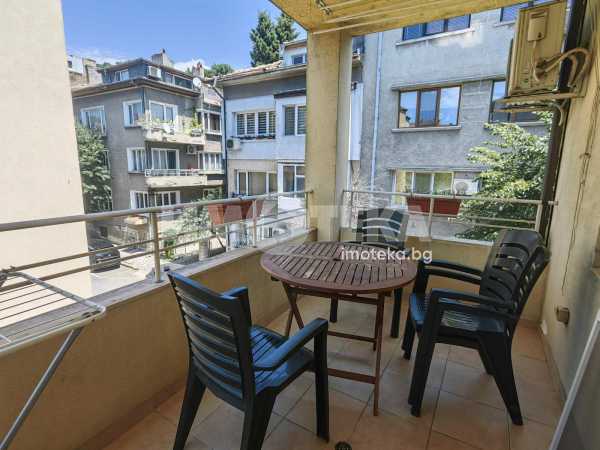 Двустаен апартамент, на тиха улица, на метри от пешеходната зона. Разполага със светла и просторна дневна, уютна спалня, дълбока тераса с маса и столчета. Жилището е напълно обзаведено, отоплява се с климатик в дневната и конвекторен радиатор в спалнята. Дългосрочно.