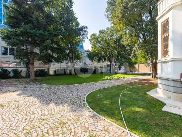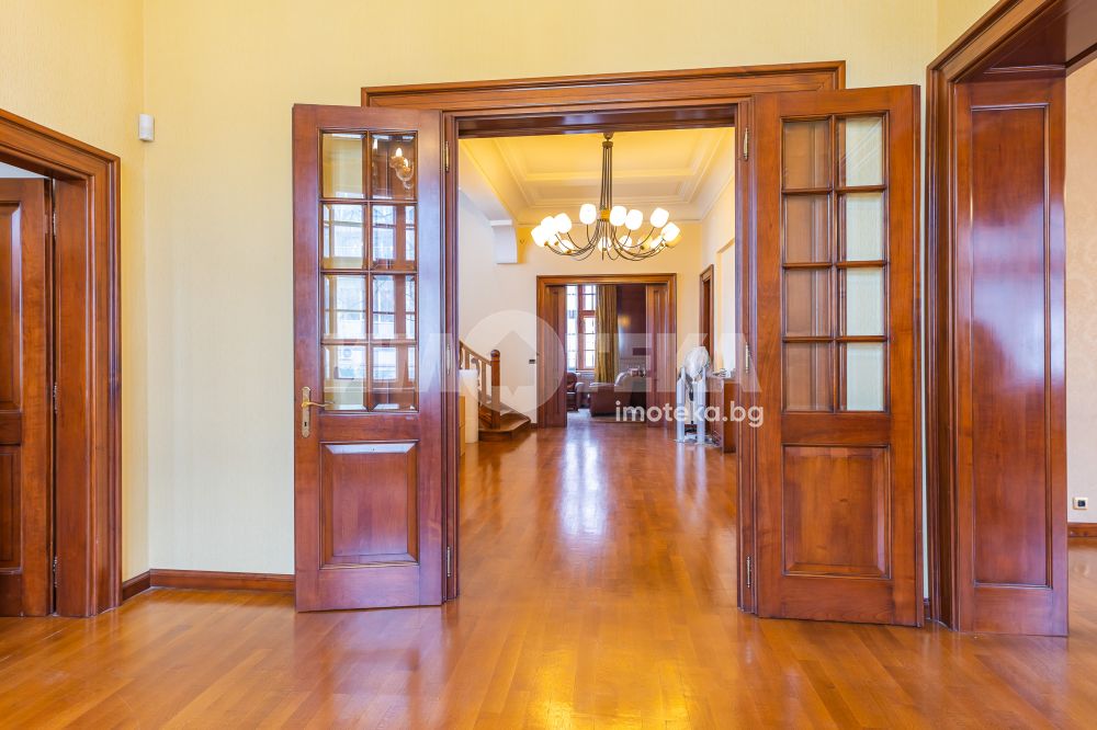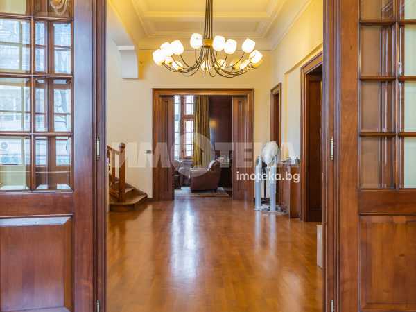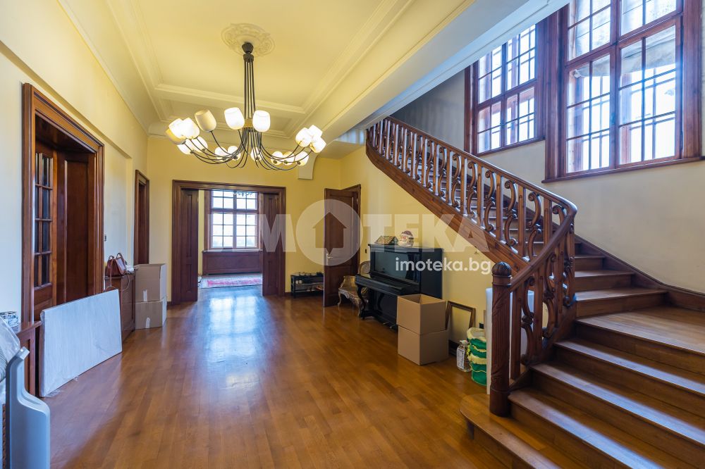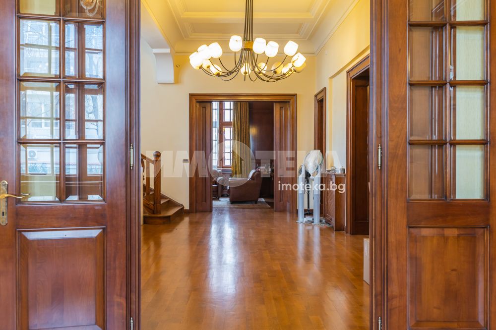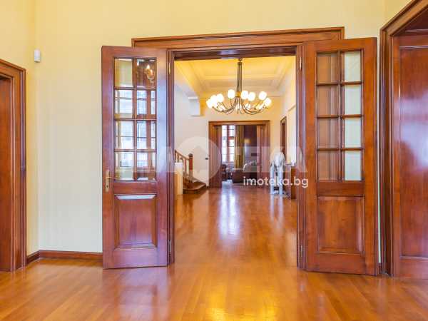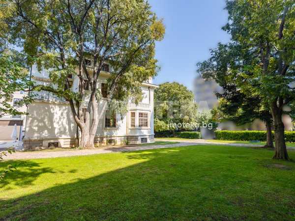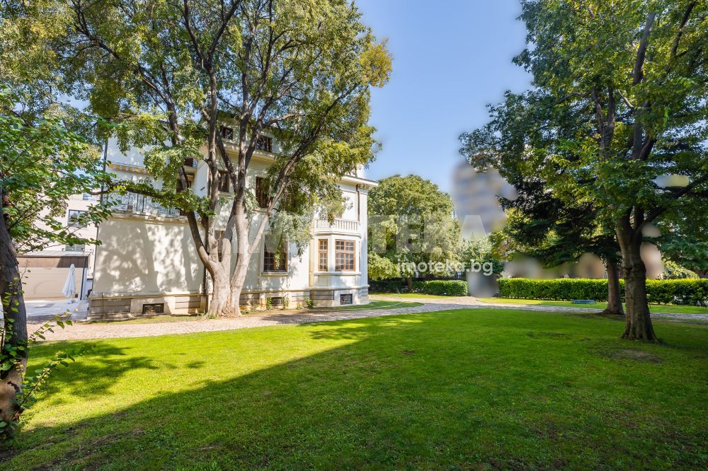Имотът е разположен в парцел с площ 1950кв.м, в който има голям басейн, поддържана градина, самостоятелна постройка със сауна до басейна, много зеленина, дълго отглеждани дървета. Къщата е на 3 жилищни и един сутеренен етаж - всеки от тях по 266кв.м. Площта е разпределена между голямо антре, вестибюл, гостна, трапезария/ кухня , 10 помещения, 5 бани със санитарни възли, складови помещения, стая за централно отопление, 3 отделни входа към имота. Предлага се частично обзаведена-само с трайно прикрепените мебели /по поръчка/ от масивно дърво. Паркирането е обезпечено за минимум 10 автомобила - закрити паркоместа за 5 автомобила и възможност за паркиране на поне още 5 в открит паркинг.