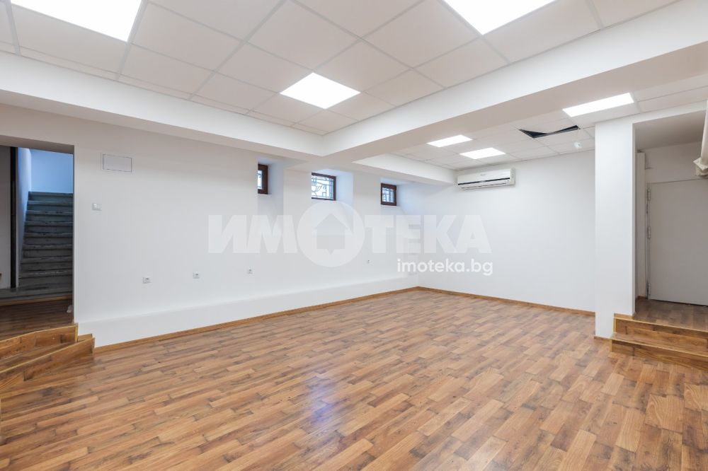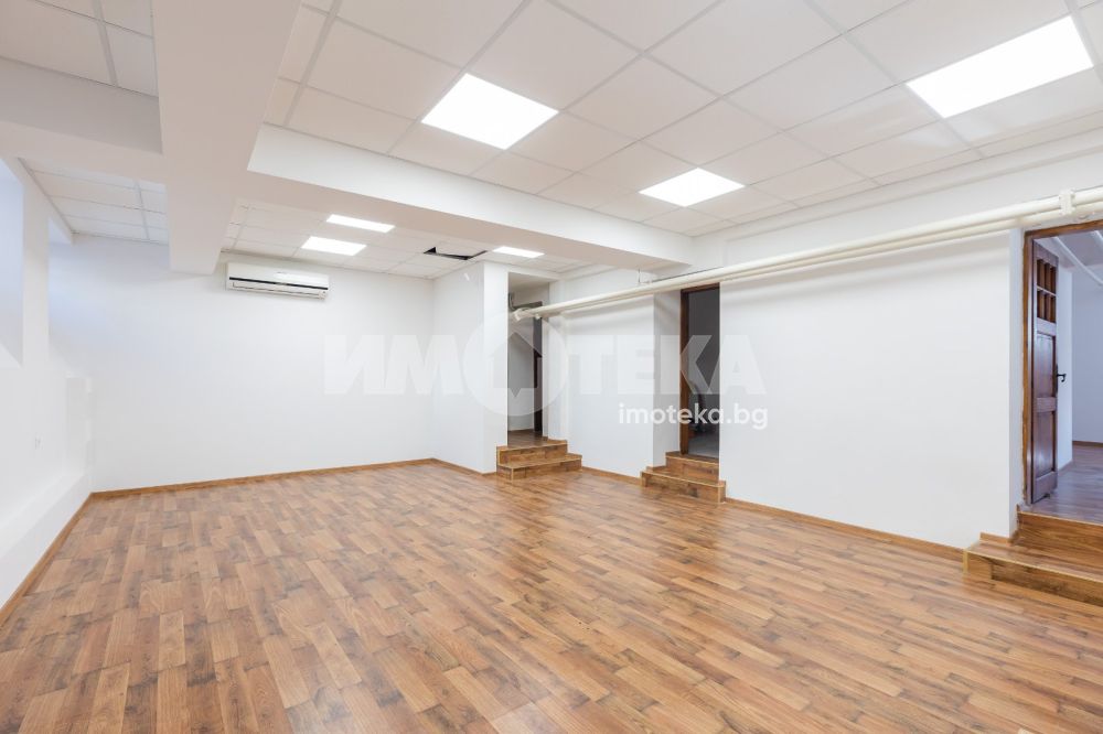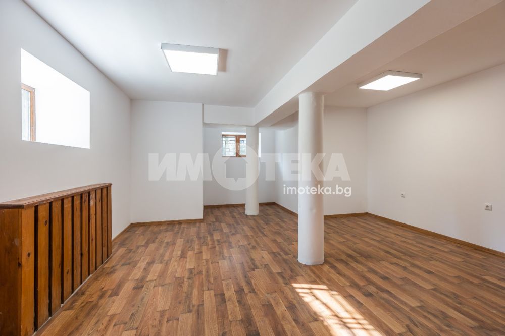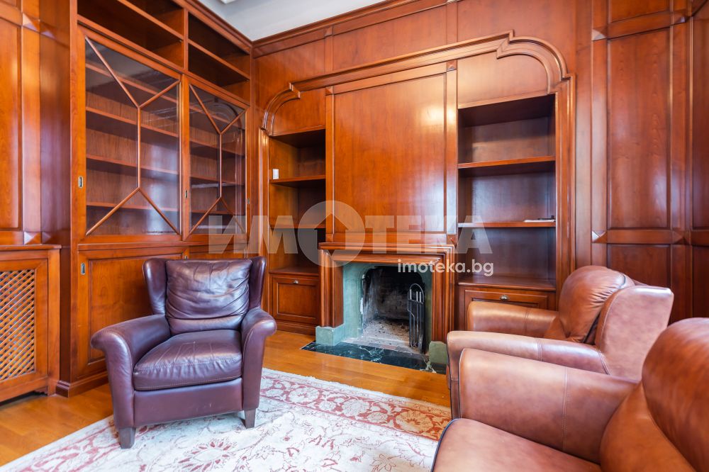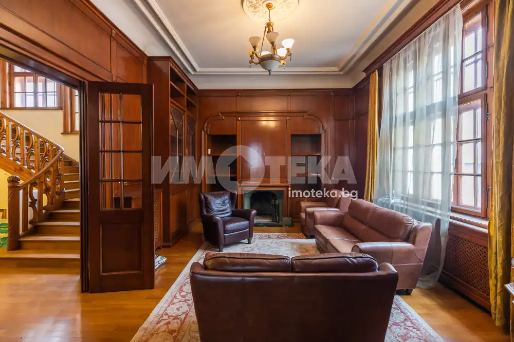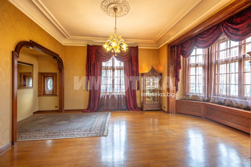 Имотът е разположен в парцел с площ 1950кв.м, в който има голям басейн, поддържана градина, самостоятелна постройка със сауна до басейна, много зеленина, дълго отглеждани дървета. Къщата е на 3 жилищни и един сутеренен етаж - всеки от тях по 266кв.м. Площта е разпределена между голямо антре, вестибюл, гостна, трапезария/ кухня , 10 помещения, 5 бани със санитарни възли, складови помещения, стая за централно отопление, 3 отделни входа към имота. Предлага се частично обзаведена-само с трайно прикрепените мебели /по поръчка/ от масивно дърво. Паркирането е обезпечено за минимум 10 автомобила - закрити паркоместа за 5 автомобила и възможност за паркиране на поне още 5 в открит паркинг.