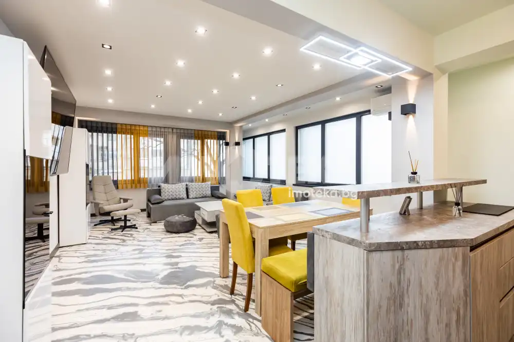 Предлагаме на вниманието Ви, изискан дом, разположен в идеалния център на град Варна. Жилището предлага всичко онова, което би задоволило вкусът и изискванията на клиенти с висок жизнен стандарт. Апартаментът се състои от слънчева просторна дневна с трапезария, холна зона и обособена кухня, две спални и три сервизни помещения, баня с тоалет, тоалет и перално помещение, има принадлежащи таванска стая (отдадена под наем) и офис/кабинет в сутерена на сградата със собствен санитарен възел и обособен кухненски бокс, както и идеална част от двора 30,65 кв.м която осигурява възможност за паркиране. Предлага се напълно обзаведен и оборудван.