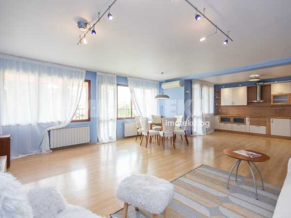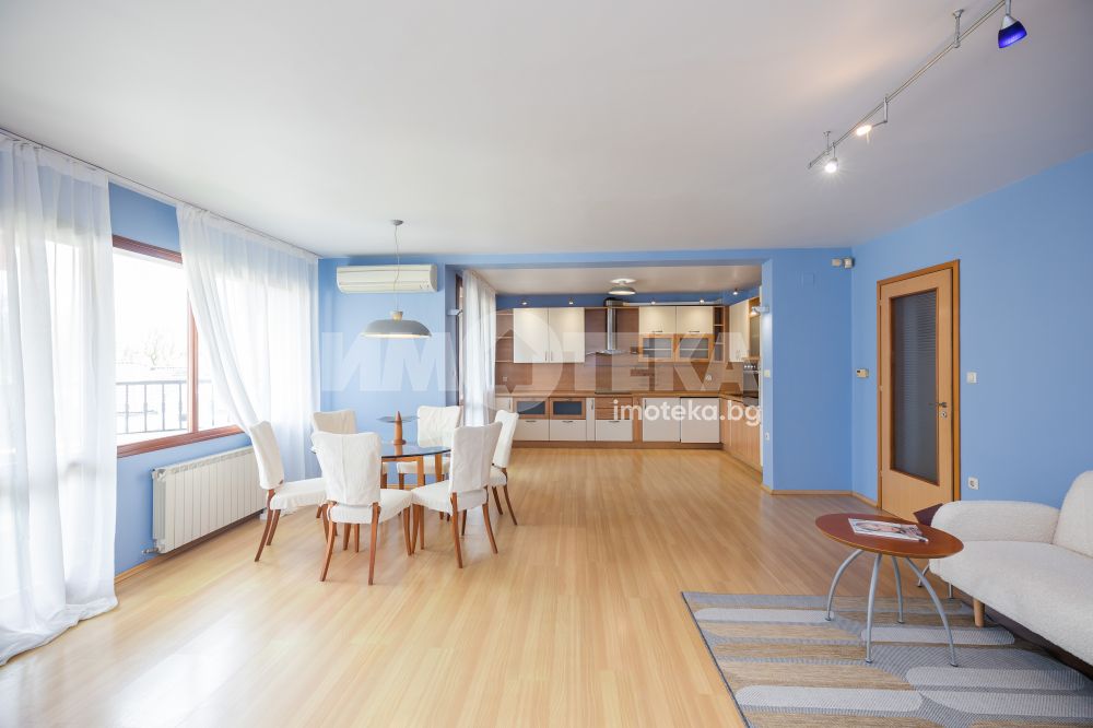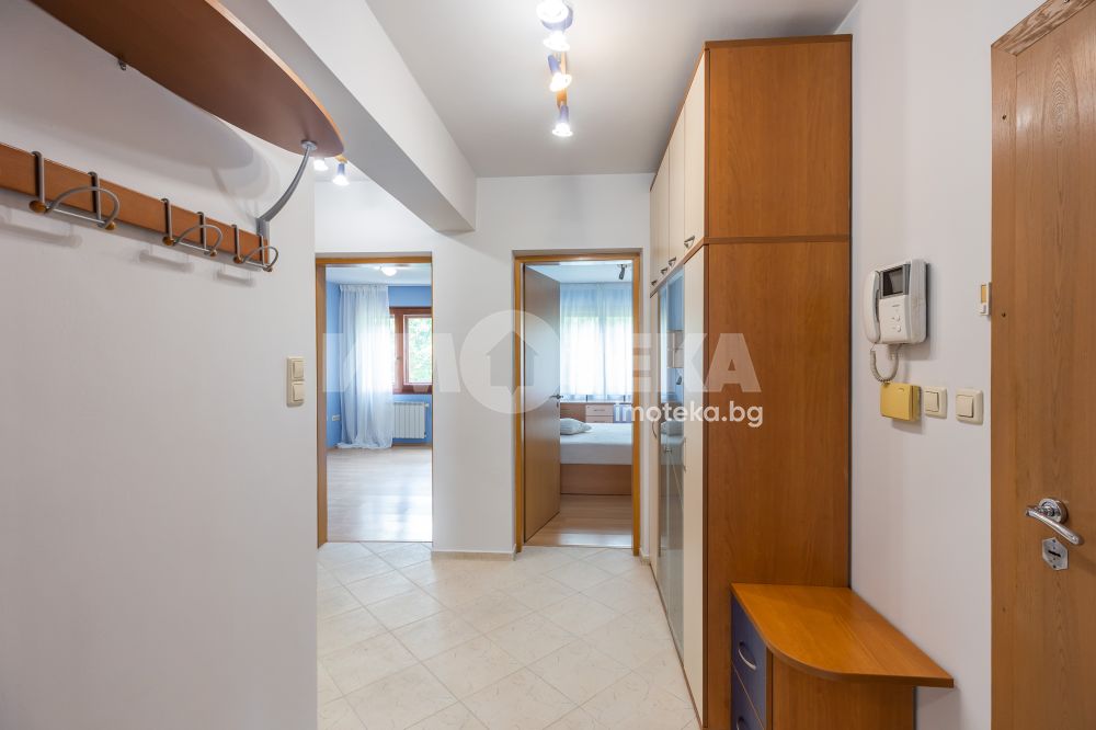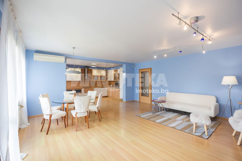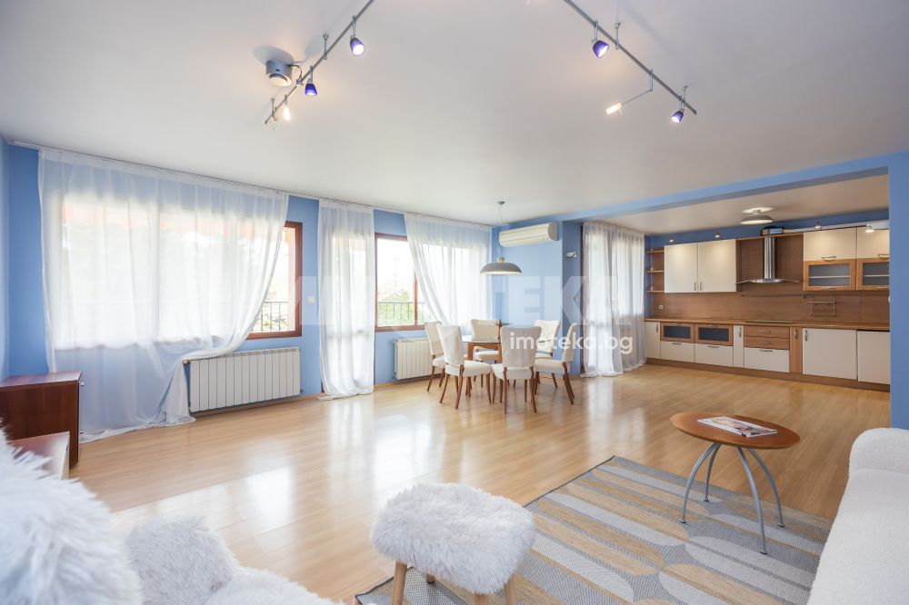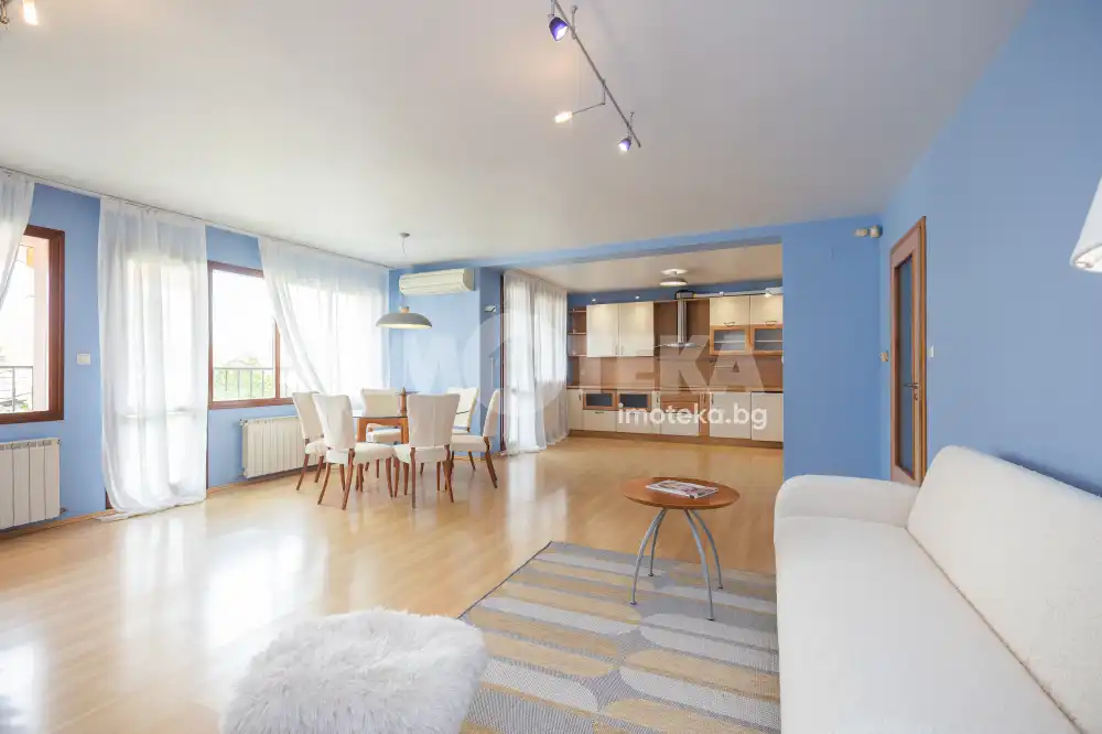 Жилището включва голяма дневна с кухня и две тераси с приятна гледка, две просторни спални с обща тераса, баня с тоалетна, отделна тоалетна, килер и антре. Отлично разпределение, много светлина и комфорт, с електрическо отопление във всички помещения.