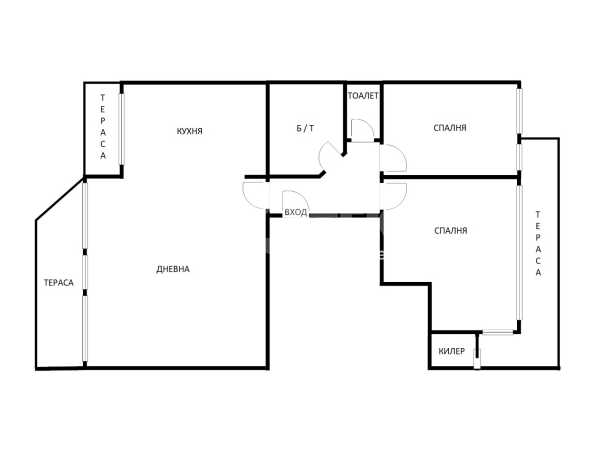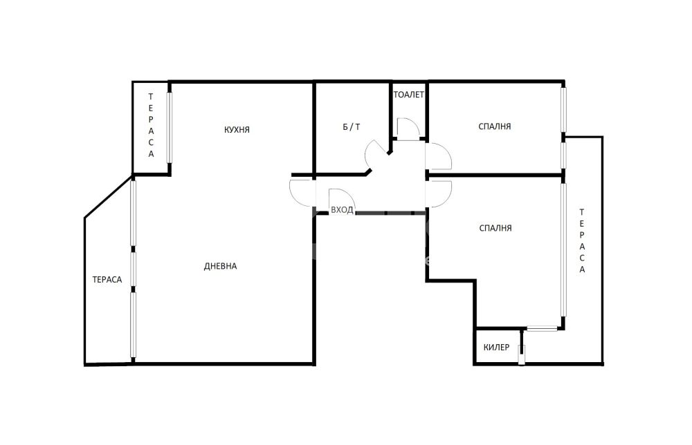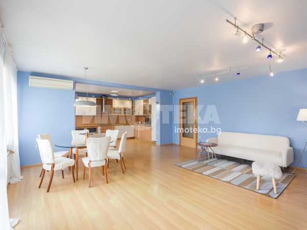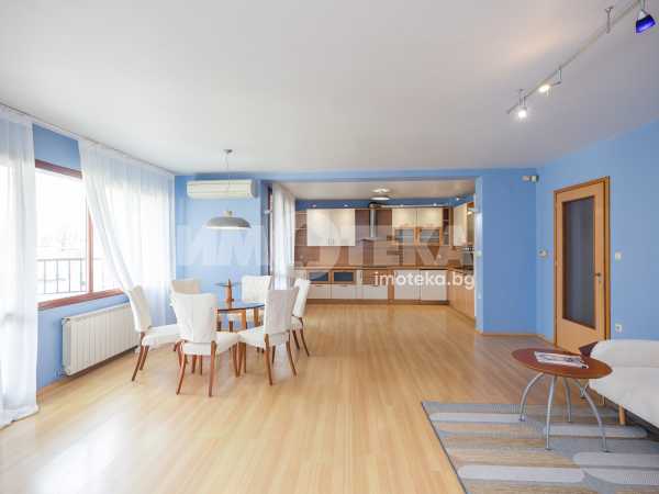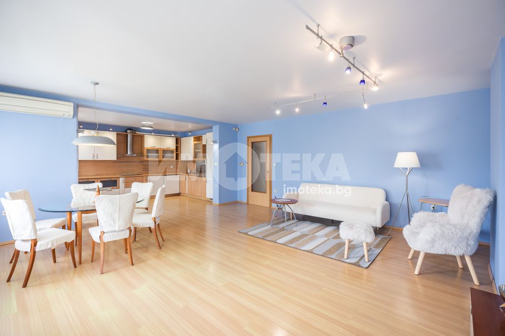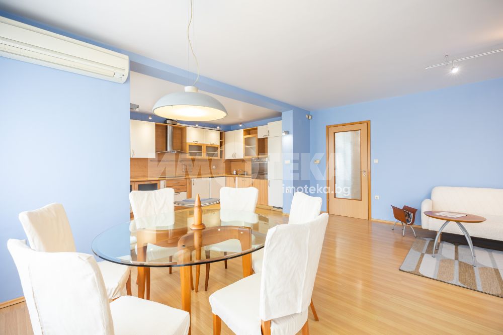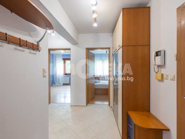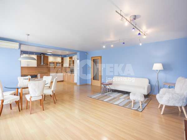 Жилището включва голяма дневна с кухня и две тераси с приятна гледка, две просторни спални с обща тераса, баня с тоалетна, отделна тоалетна, килер и антре. Отлично разпределение, много светлина и комфорт, с електрическо отопление във всички помещения.