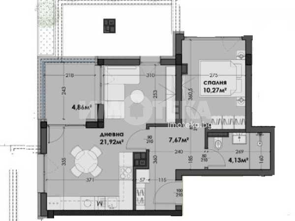 Апартаментът представлява двустранно осветена всекидневна 22 м2 с прилежаща тераса 5 м2; спалня, баня с тоалетна и функционален коридор.