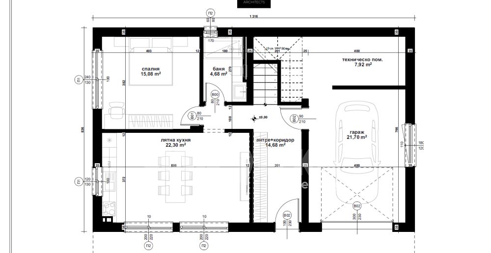 Етаж 1: със спалня, прекрасна лятна кухня, гараж с топла връзка, баня, техническо помещение.