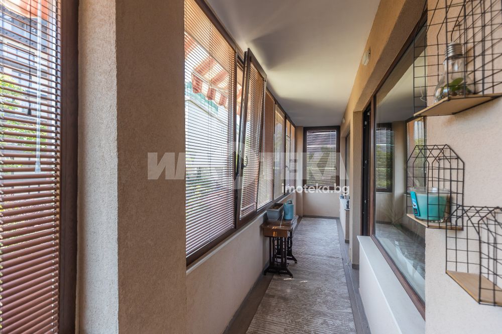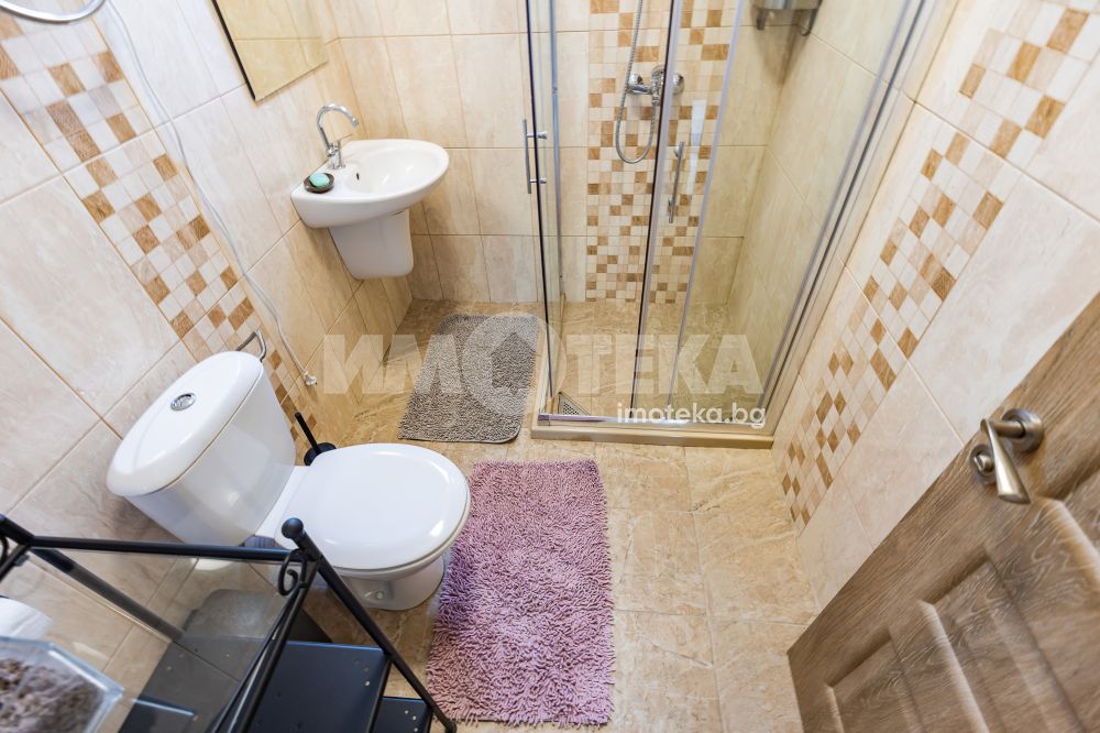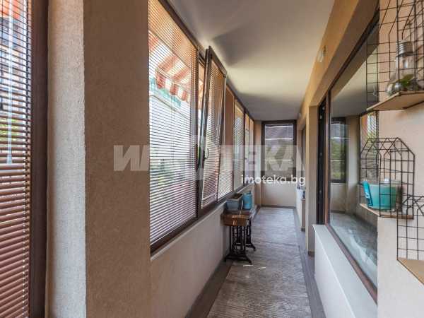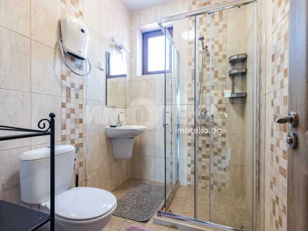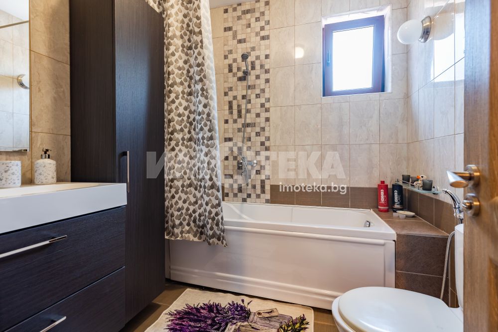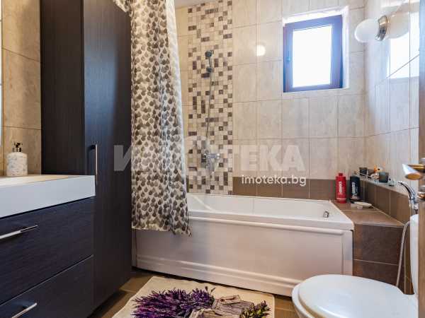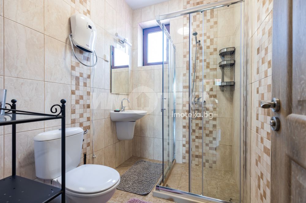 Сградата е построена и актувана през 2019 година. Отлично проектирана , с всички удобства на съвременния начин на живот Използвани са качествени материали, тухли Винербергер, 10 см изолация и минерална мазилка. Присъединена е към градска канализация, ВиК за питейна вода, има кладенец, трифазен ток, а така също на покрива е изградена соларна система с панели. На първи етаж има дневна 50 кв. м, спалня, баня с тоалетна, душ и вана, техническо помещение, склад, сауна със съблекалня, душ и място за релакс. По широки вътрешни стълби към втория етаж се стига до две детски с обща баня с тоалет и душ, родителска спалня със собственна баня с хидромасажна вана. Трите спални излизат на обща остъклена южна тераса с изглед към града и морето. Отоплението е решено с климатици във всяка стая, камина на дърва в дневната, пододво отопление на ток в дневната и в две от баните.