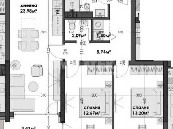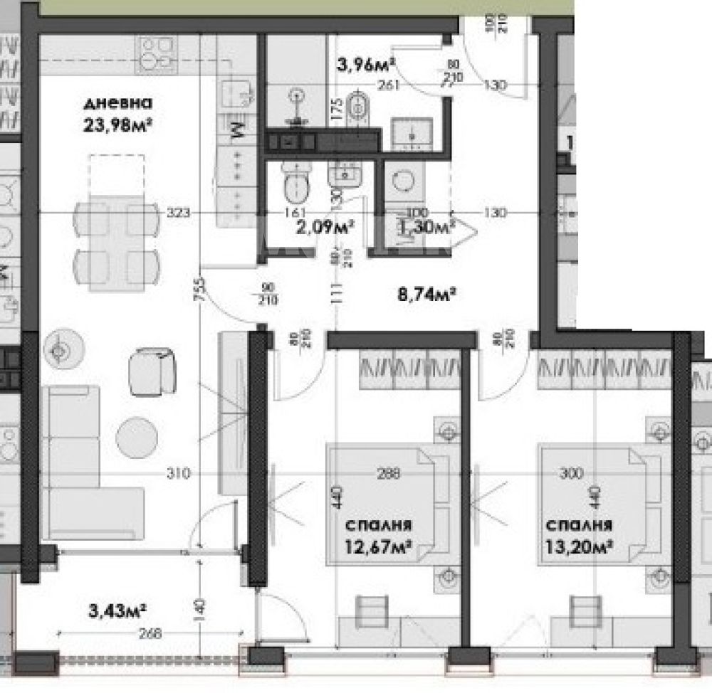 Апартаментът е изцяло среден, покрит, без скосове и правилни форми на стаите.
