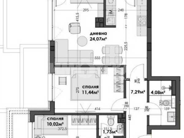Отличен тристаен апартамент с просторна двустранно осветена всекидневна 24 м2 и тераса 7 м2 пред нея; две спални; баня с толетна и самостоятелна тоалетна.