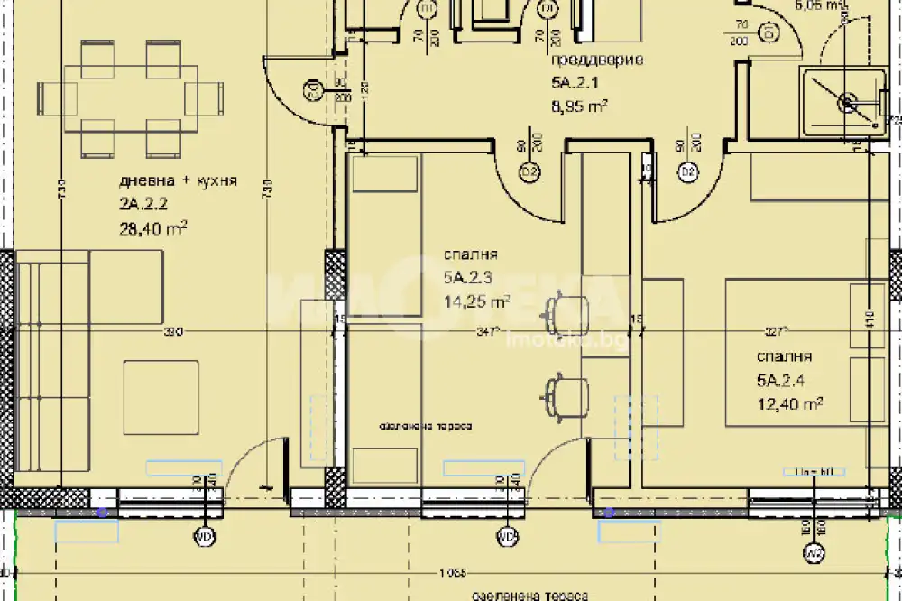Тристаен апартамент на партерен етаж, състоящ се от дневен тракт, две спални, баня с тоалет, тоалет, килер, предверие, две тераси и в допълнение озеленена тераса 30 кв.м.