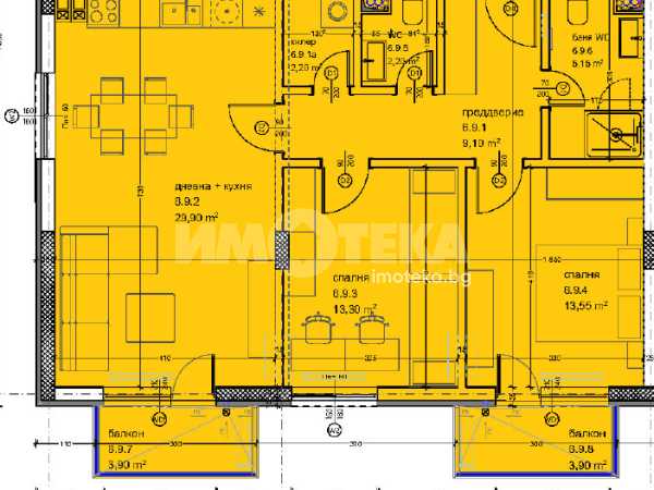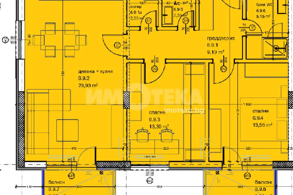 Тристаен апартамент на среден етаж, състоящ се от дневен тракт, две спални, баня с тоалет, тоалет, килер, предверие и две тераси с южно изложение.