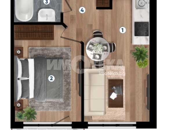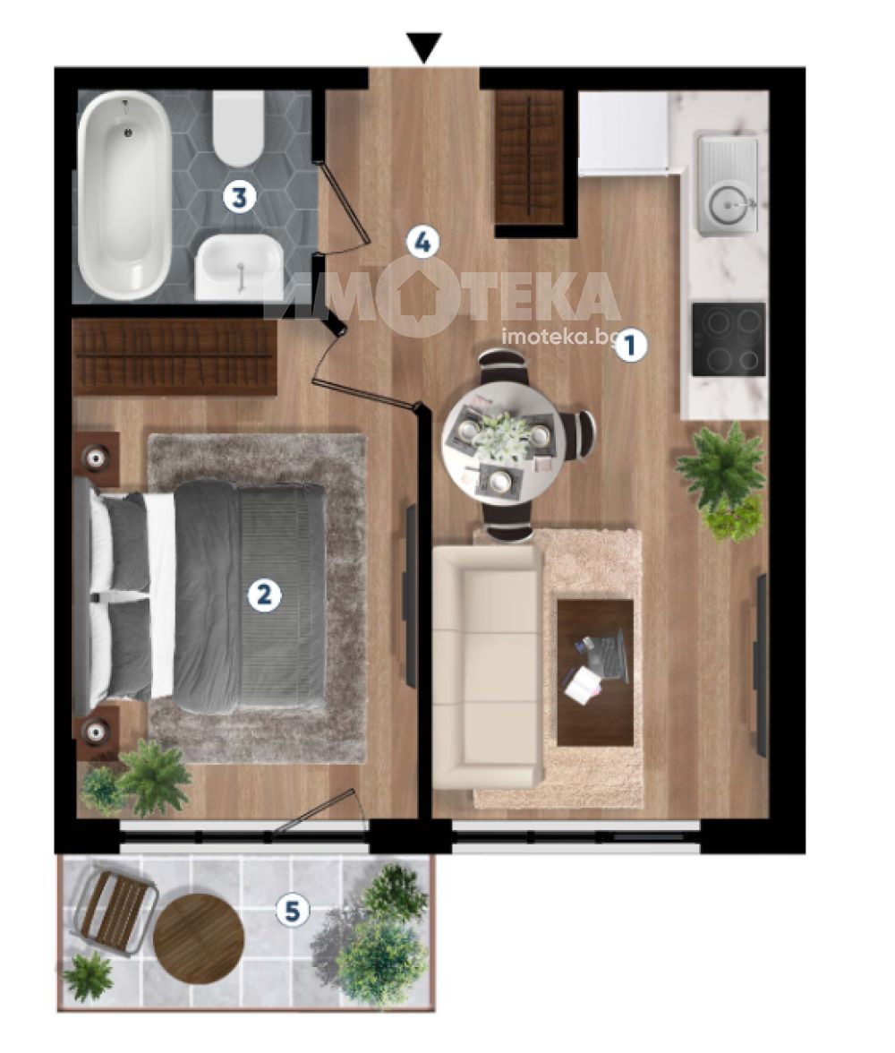 Двустаен апартамент, състоящ се от дневна с кухня и трапезария, спалня, баня с тоалетна, коридор, тераса. Имотът ще се издава по БДС с възможност завършен до ключ. Опция за обзавеждане по индивидуален интериорен проект. За вашето спокойствие и удобство предлагаме закрит детски център с различни играчки, съобразени с възрастовата група, както за най-малки, така и за по-големи деца. Ще бъде изградена комбинирана зона за практикуване на няколко любими спортни занимания сред природата, басейн. С предварителна заявка бихте могли да наемете барбекюто и да се насладите на удоволствието от самостоятелното приготвяне на вкусна храна с близки или семейна компания.
