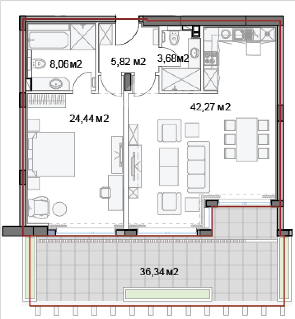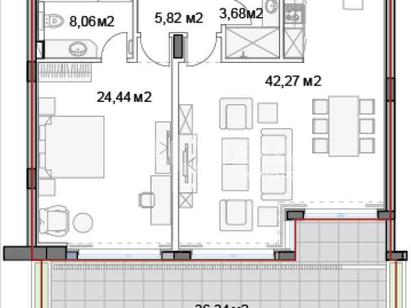 Предлагаме за продажба двустаен апартамент. Жилището се състои от голяма всекидневна с кухненски бокс, голяма спалня, две санитарни помещения и панорамна тераса.