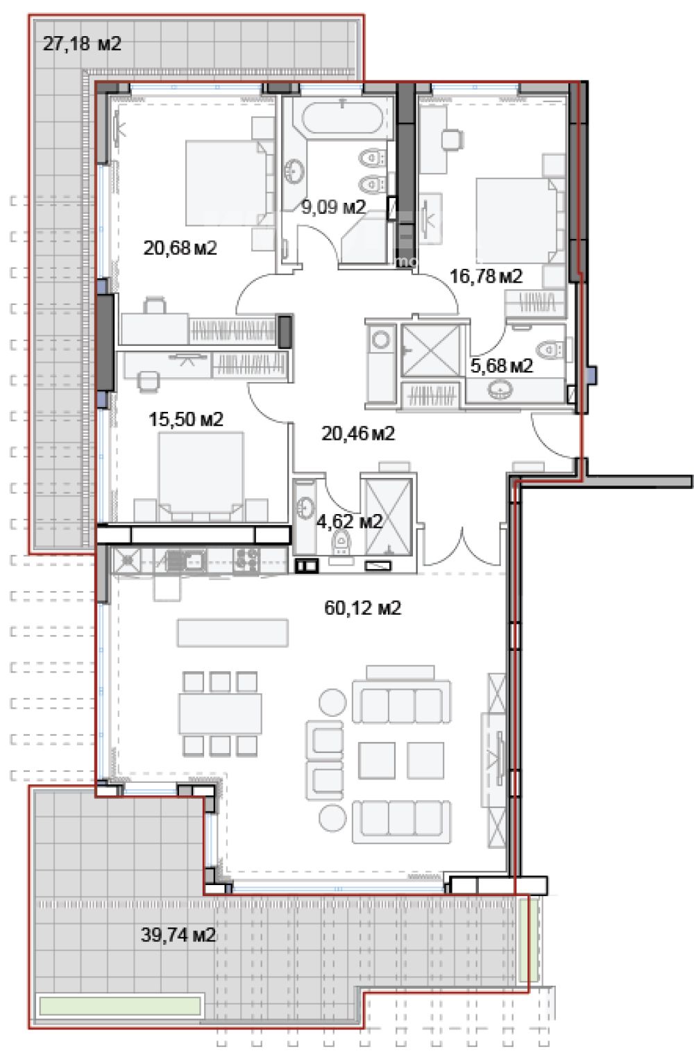 Предлагаме за продажба многостаен апартамент. Жилището се състои от голяма всекидневна с кухненски бокс, три големи спални, три санитарни помещения и панорамна тераса.