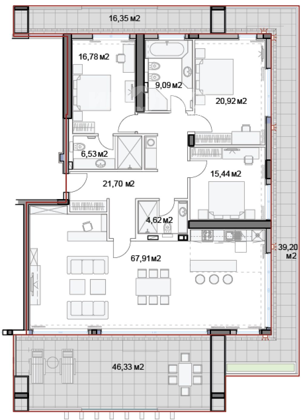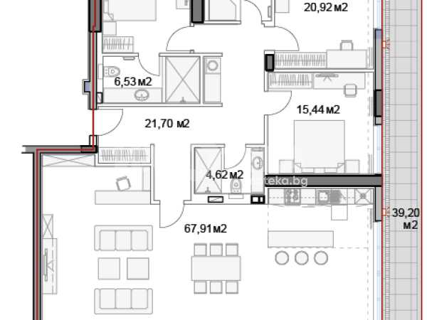 Предлагаме за продажба многостаен апартамент. Жилището се състои от голяма всекидневна с кухненски бокс, три големи спални, три санитарни помещения и панорамна тераса.