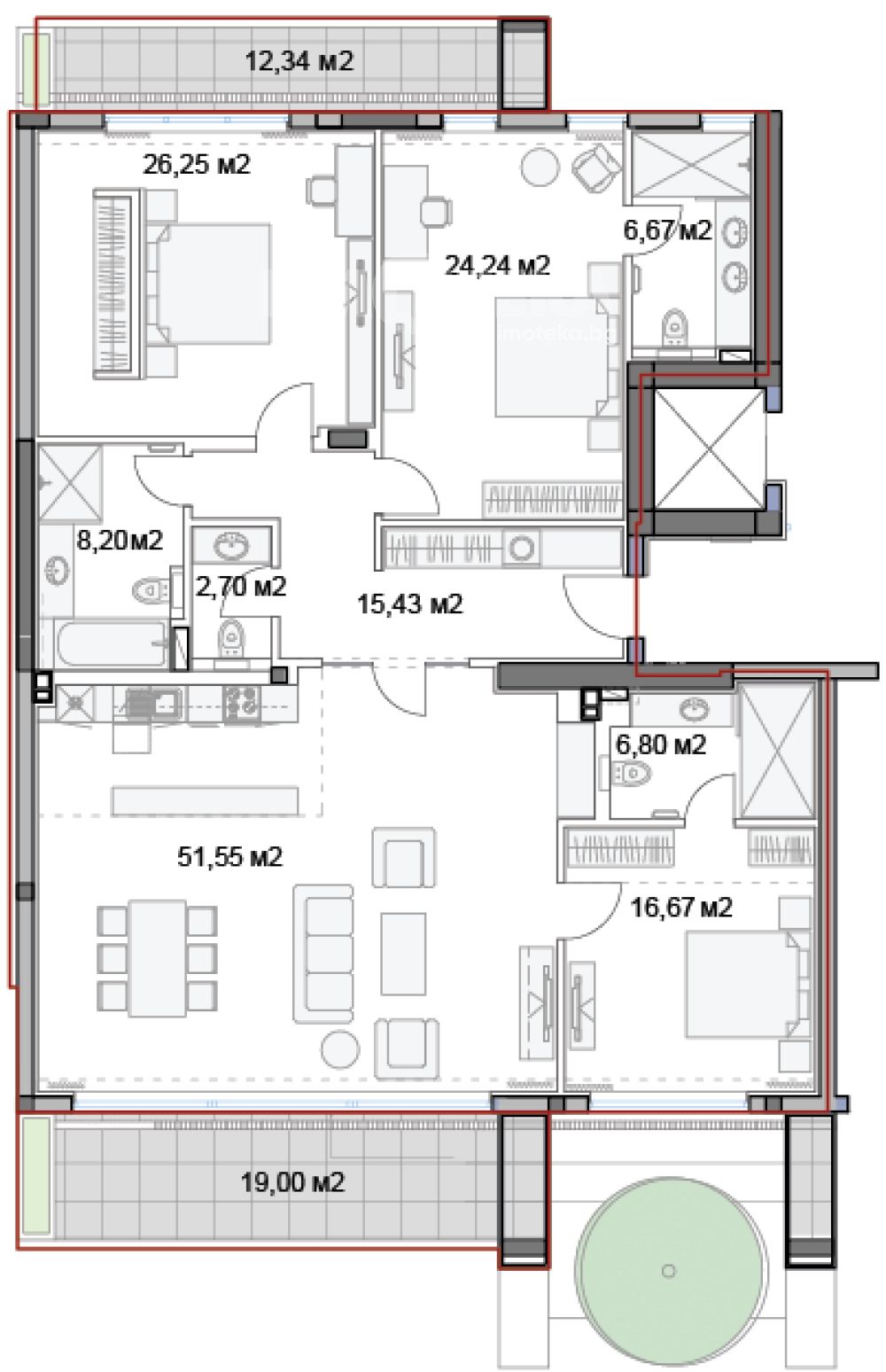 Предлагаме за продажба многостаен апартамент. Жилището се състои от голяма всекидневна с кухненски бокс, три големи спални, три санитарни помещения и панорамна тераса.