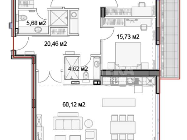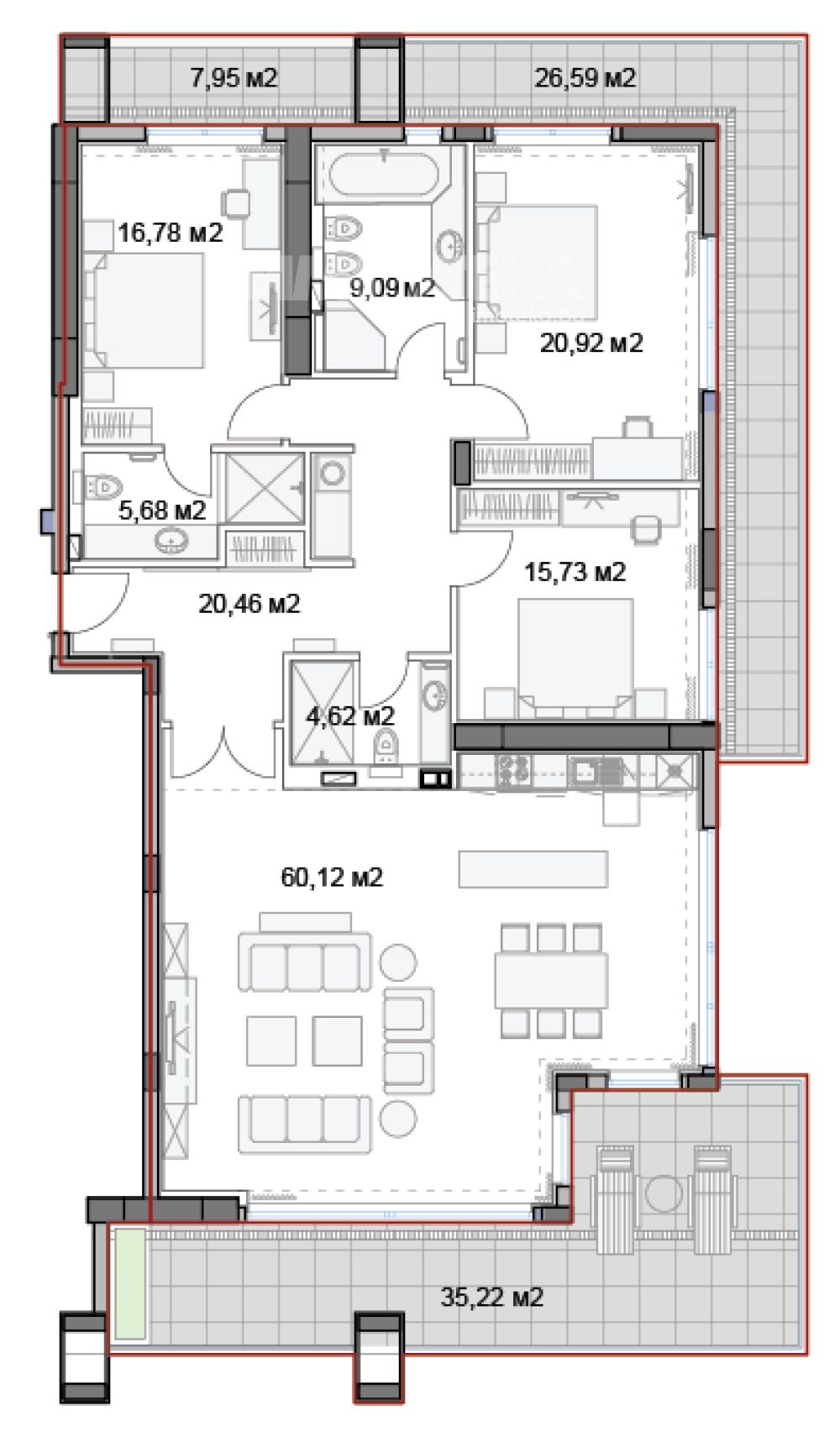 Предлагаме за продажба тристаен апартамент. Жилището се състои от голяма всекидневна с кухненски бокс, две големи спални, три санитарни помещения и панорамна тераса.