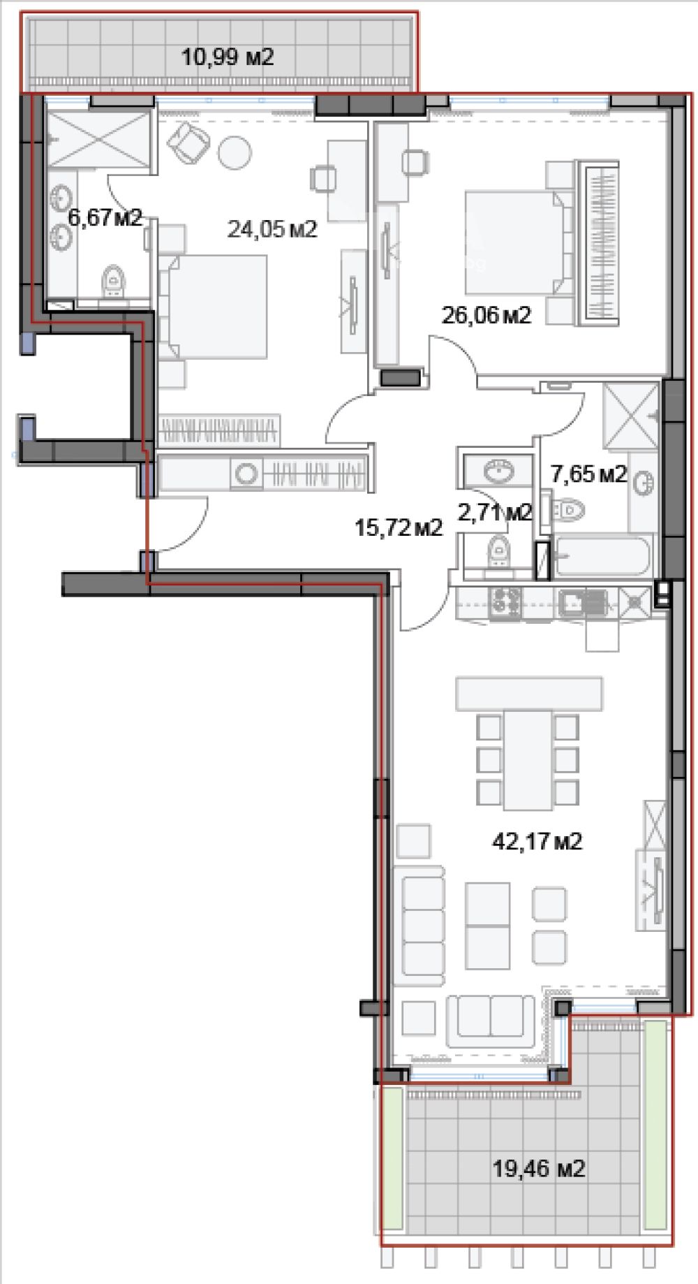 Предлагаме за продажба тристаен апартамент. Жилището се състои от голяма всекидневна с кухненски бокс, две големи спални, три санитарни помещения и панорамна тераса.