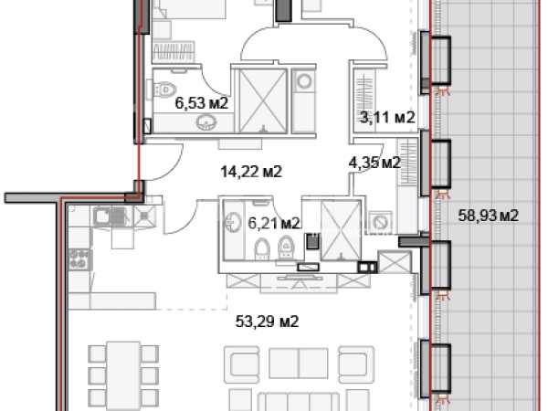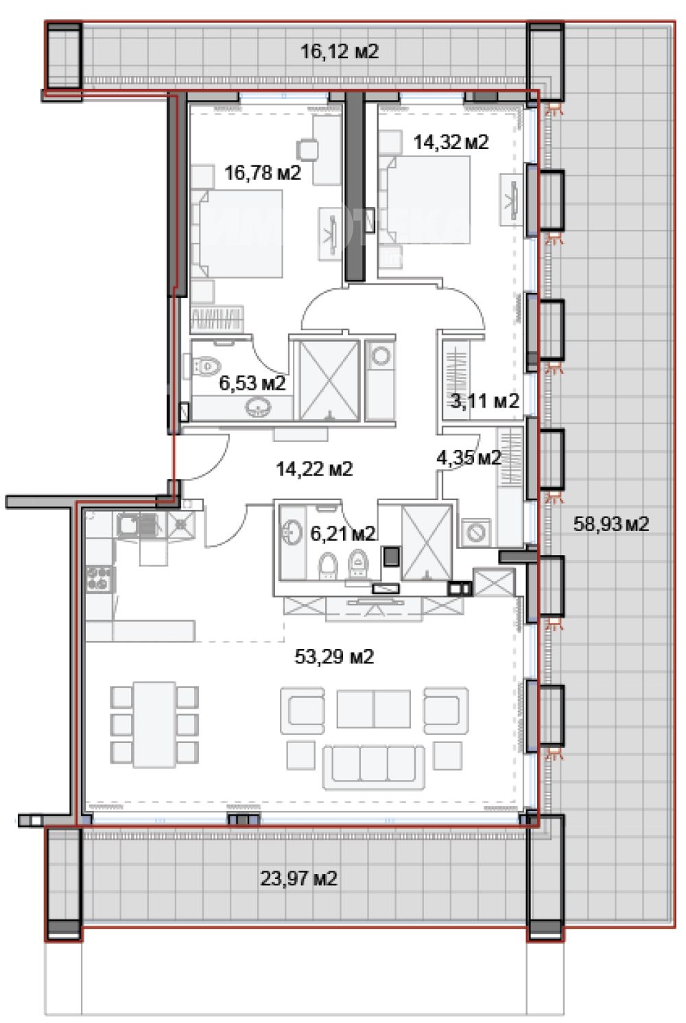 Предлагаме за продажба тристаен апартамент. Жилището се състои от голяма всекидневна с кухненски бокс, две големи спални, две санитарни помещения и панорамна тераса.