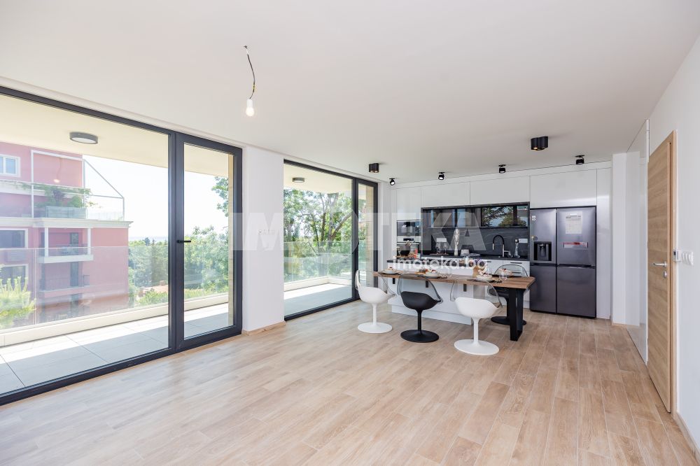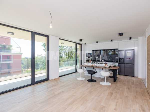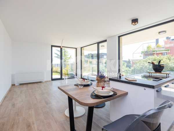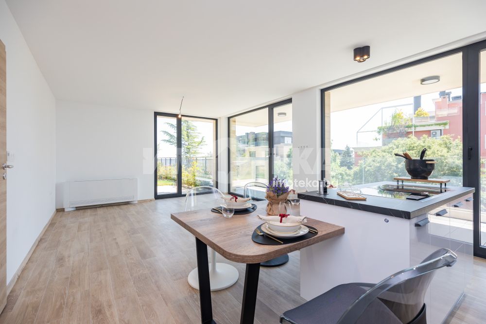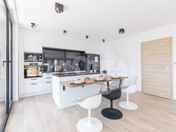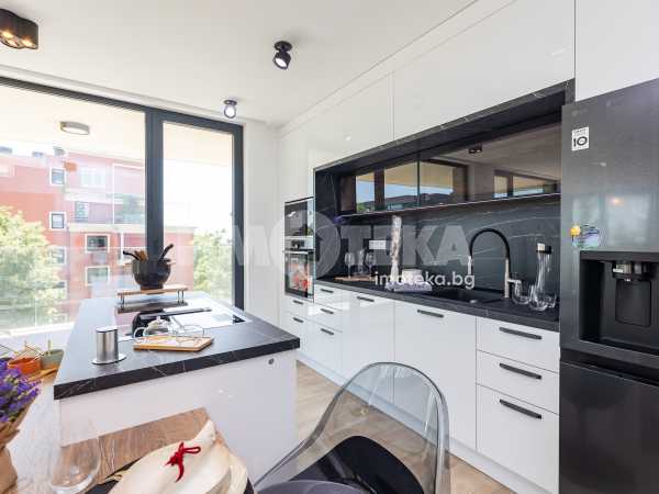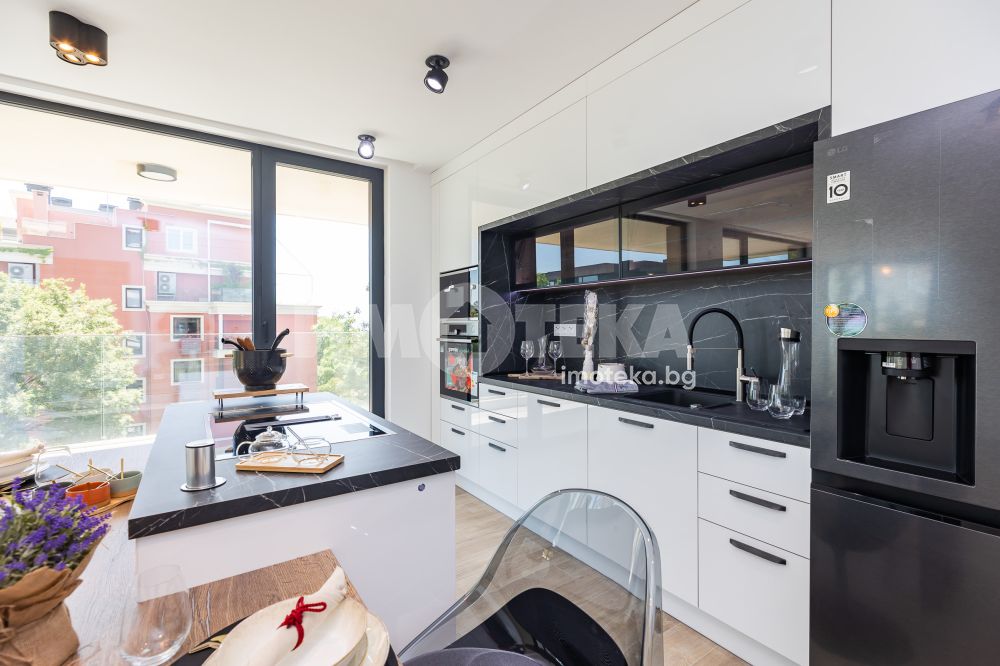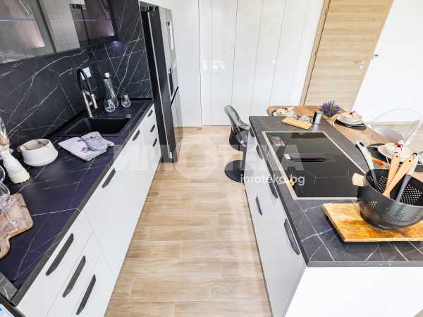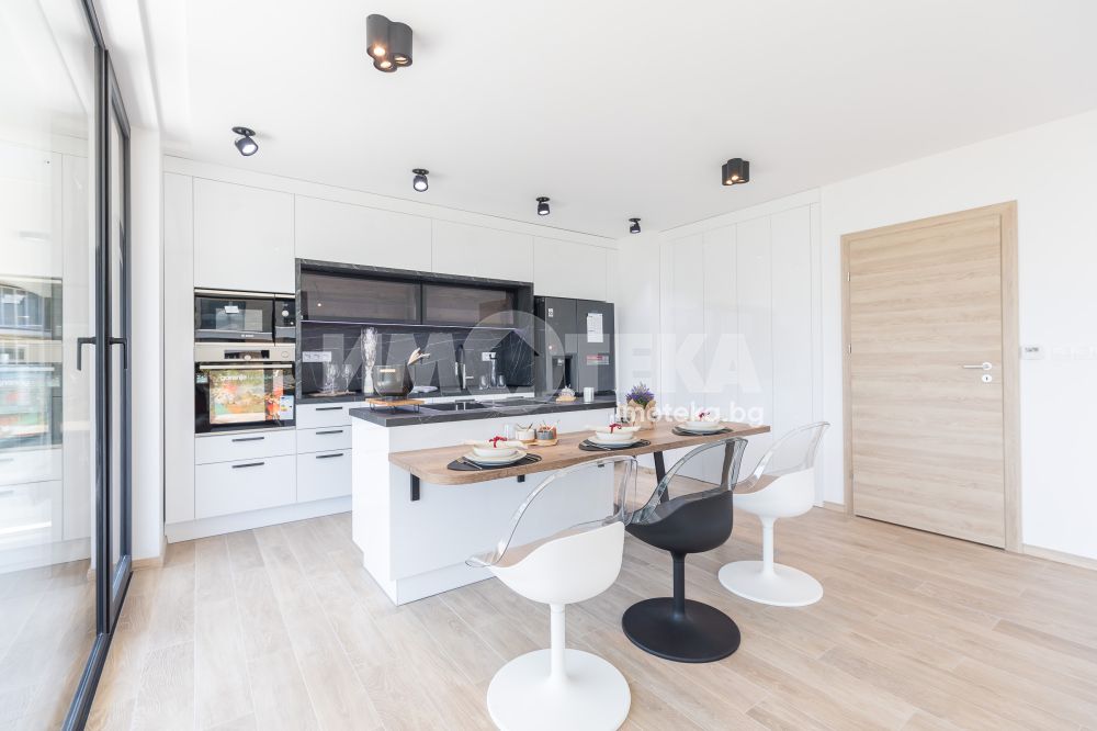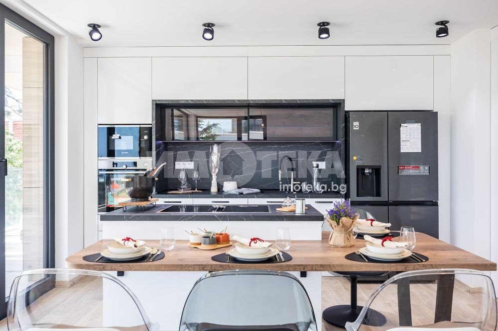 Кухнята е напълно вградена, с дизайнерски аспиратор, интегриран в работния плот, и оборудвана с електроуреди от най-висок клас, което я превръща в истинско удоволствие за готвене и ежедневна употреба.