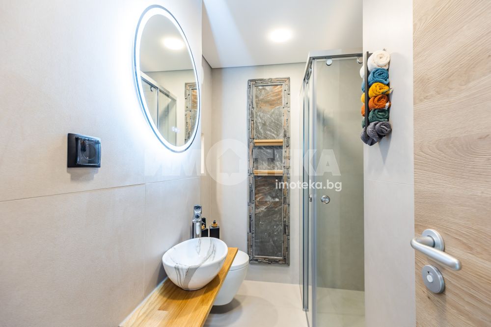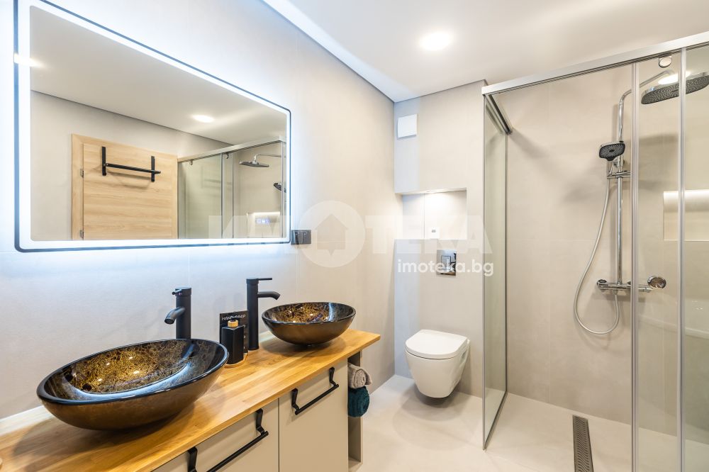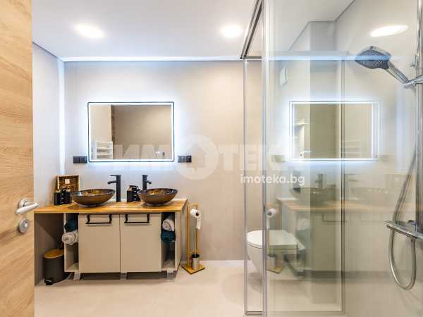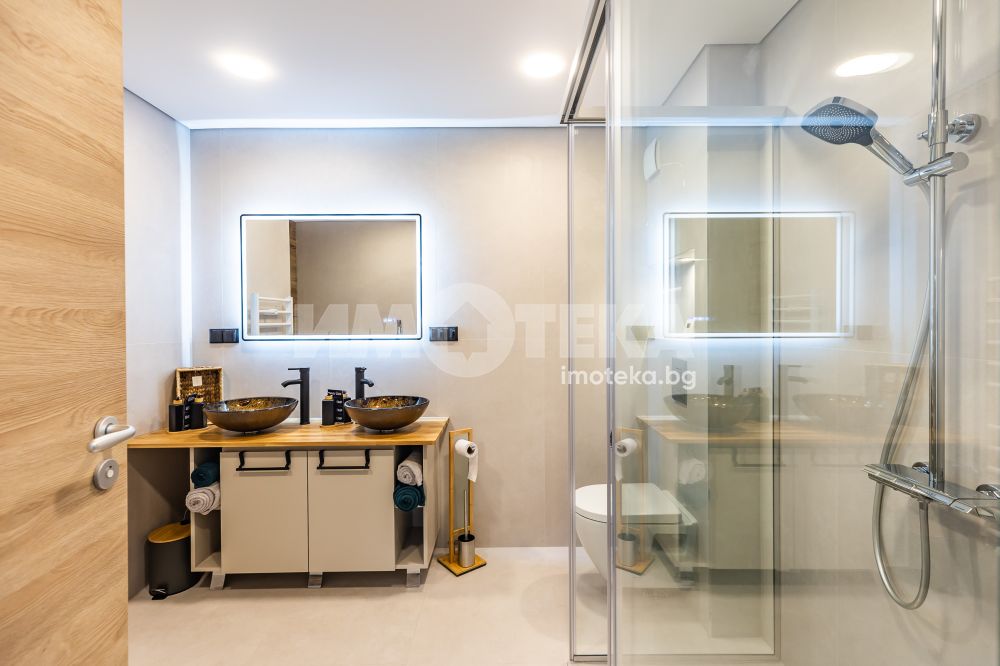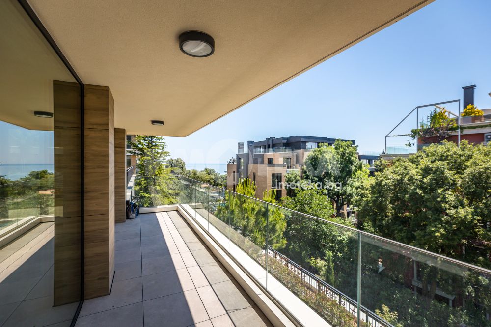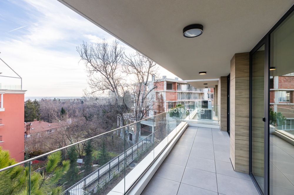 Представяме ви изключителен многостаен апартамент, изпълнен с естествена светлина и спираща дъха морска панорама. Имотът впечатлява не само с функционалното си разпределение, но и с високия стандарт на довършителни работи и модерни удобства. Жилището се състои от просторна родителска спалня с обособен дрешник, както и две уютни детски стаи, подходящи както за деца, така и за кабинет или гостна. На разположение са две модерни санитарни помещения — основна баня с тоалетна и вана, и втора баня с тоалетна и душкабина. И двете помещения са напълно оборудвани и завършени с внимание към детайла, включително музикални електрически огледала.