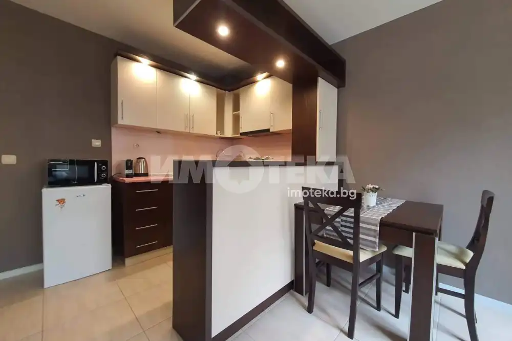 Напълно обзаведен апартамент, тип студио, находящ се в к.к.Златни Пясъци.Състои се от едно голямо и слънчево помещение разделено на кътове; баня с тоалетна и тераса.