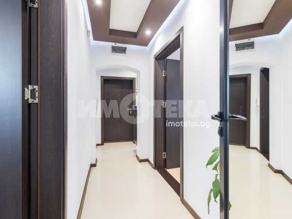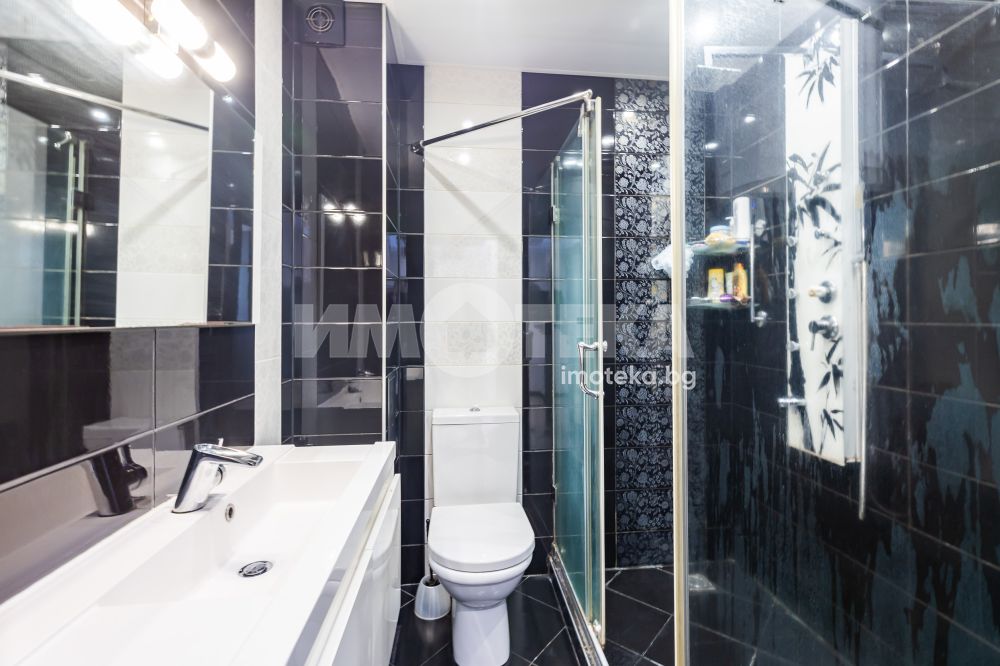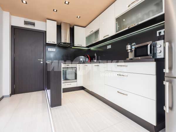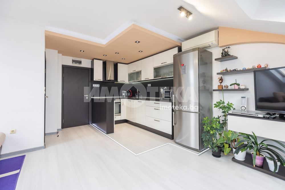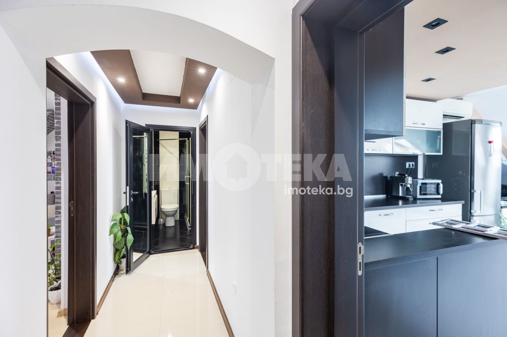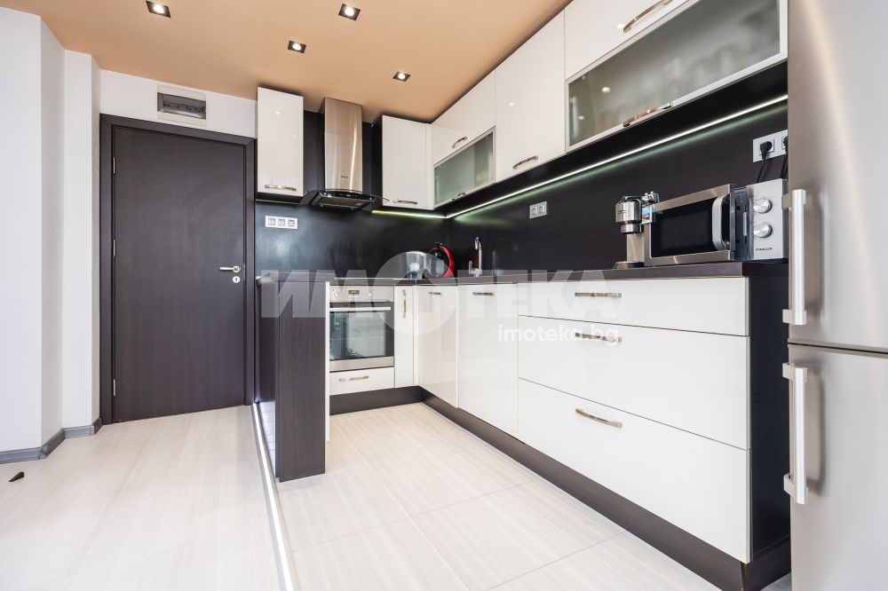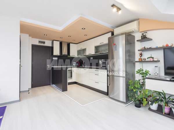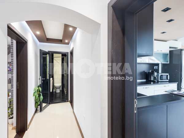 Тристаен апартамент в района на Гранд Мол. Жилището се състои от: просторен дневен тракт с обособена кухненска част с вградена кухня, трапезарна част и холна част с мека мебел, две спални, баня с тоалет, перално помещение - килер и коридор. Апартаментът се предлага отлично завършен и обзаведен с висок клас на довършителните работи, мебели и уреди. Към жилището има и избено помещение. Възможност за паркиране до един автомобил в двора на сградата. Апартаментът позволява да бъде преустроен с три спални или да се разделят два самостоятелни апартамента на двустаен и боксониера с цел отдаване под наем.