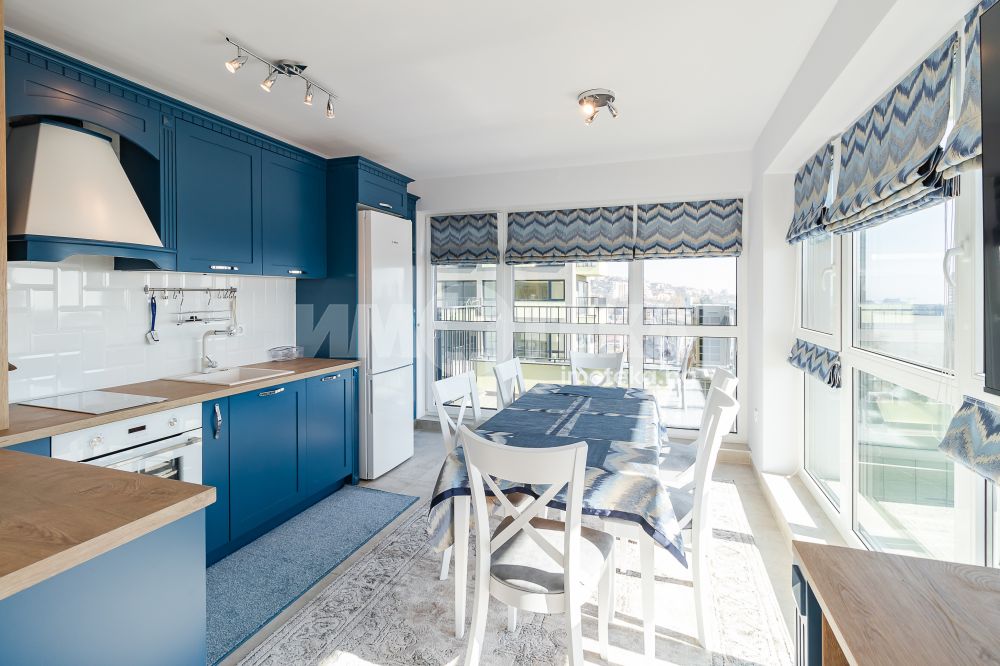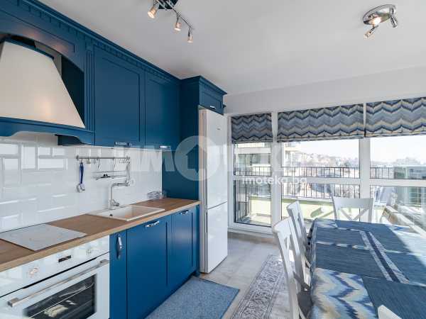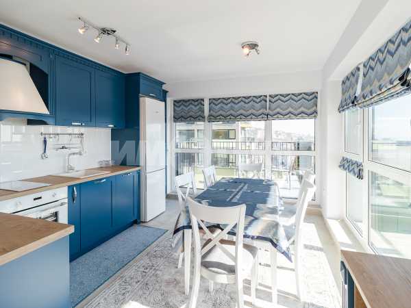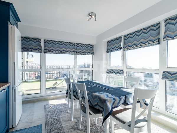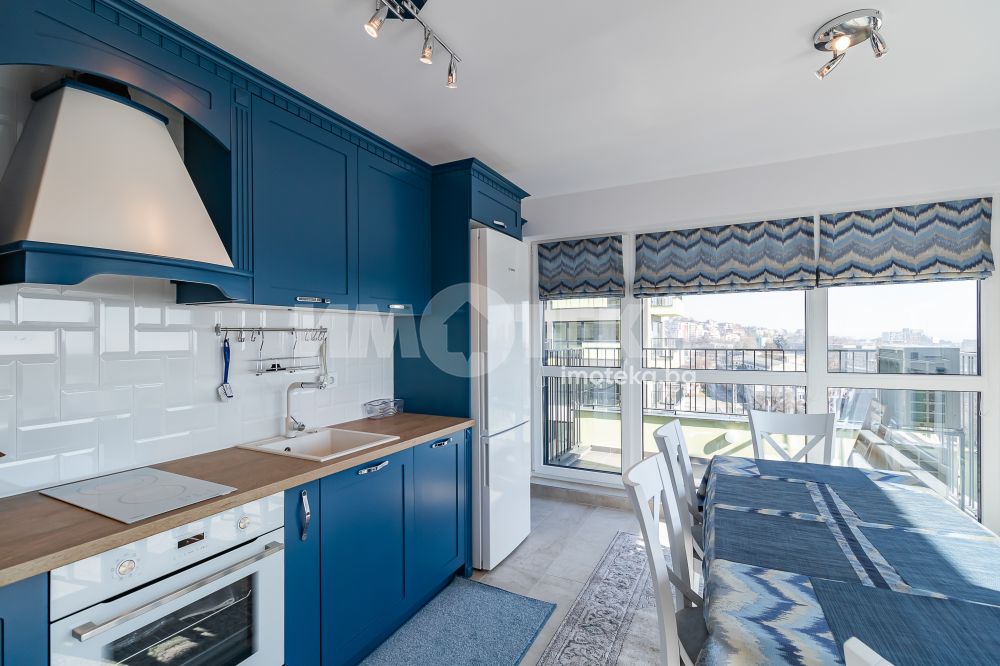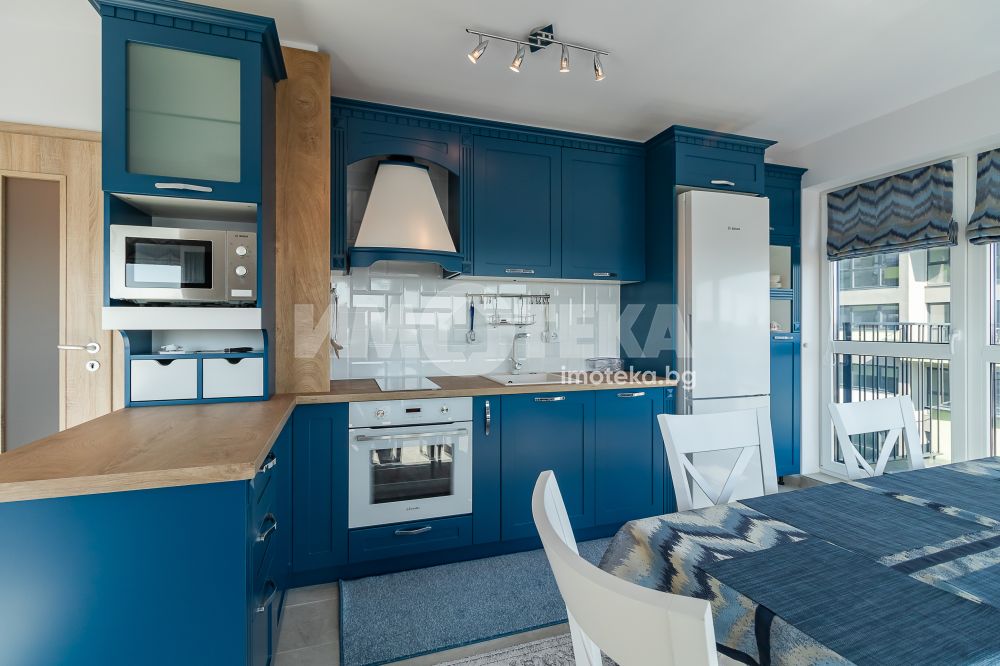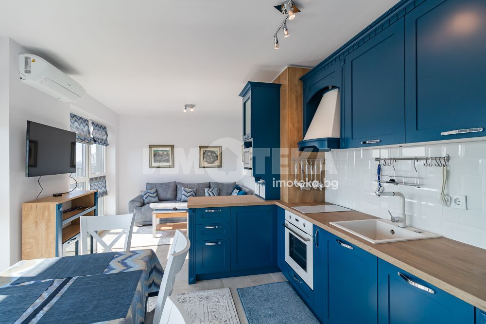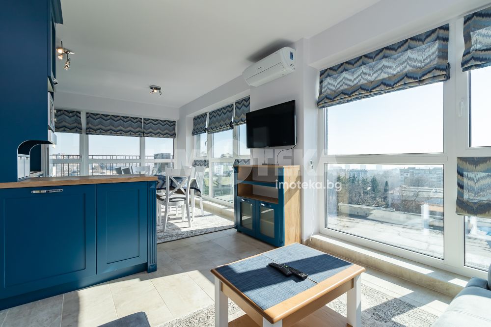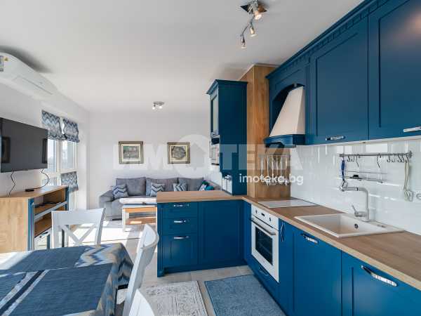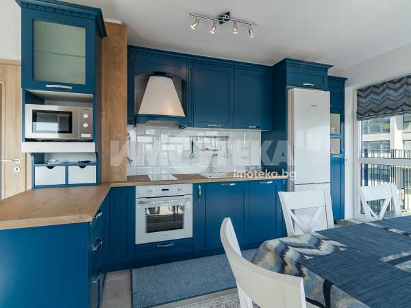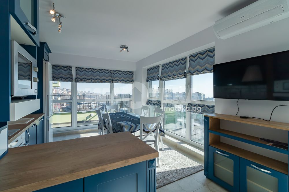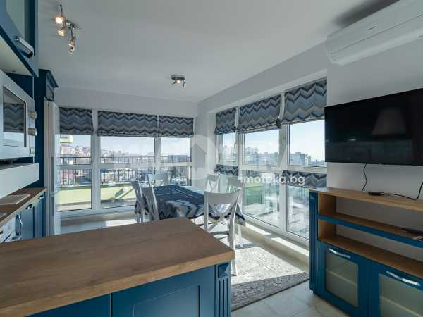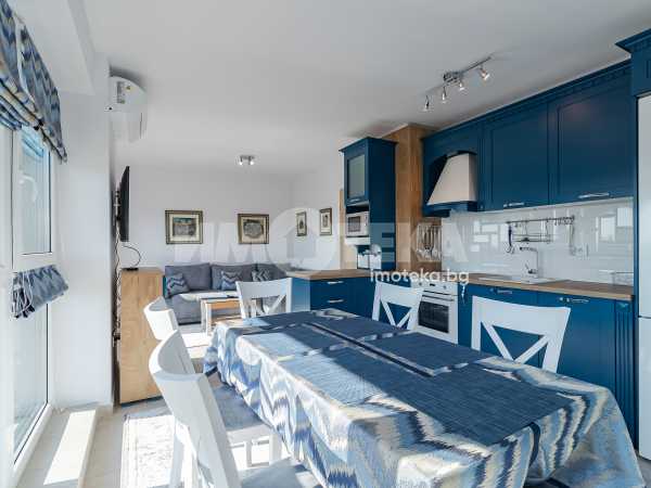 Дизайнерски обзаведен тристаен апартамент,ново строителство.Състои се от просторна дневна с модерна вградена кухня,оборудвана с бяла техника,мека мебел;две спални,два санитарни възела,единият от които е към семейната спалня.