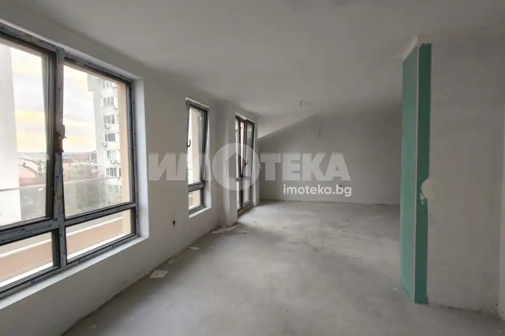 Многостаен апартамент в новопостроена сграда с АКТ 15 на последен шести етаж. Имота има собствен вход от етаж 5 и стълбище към етаж 6.