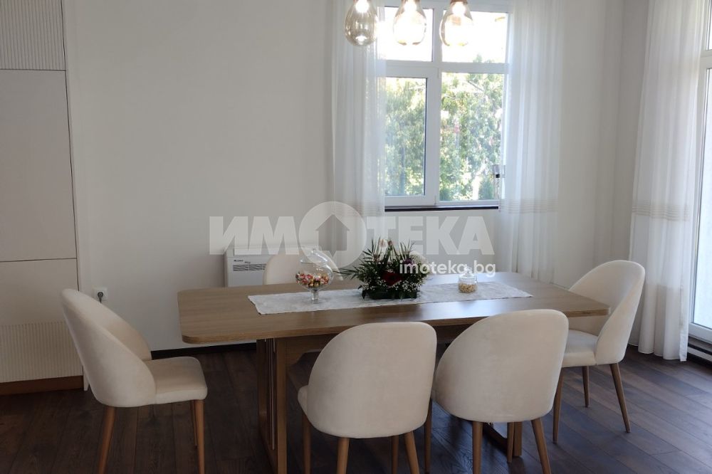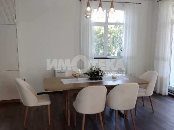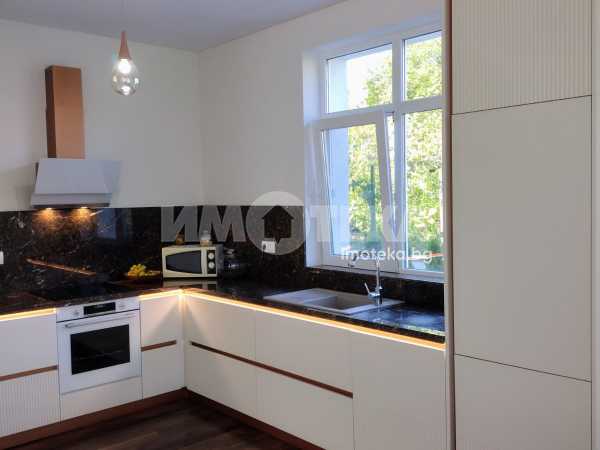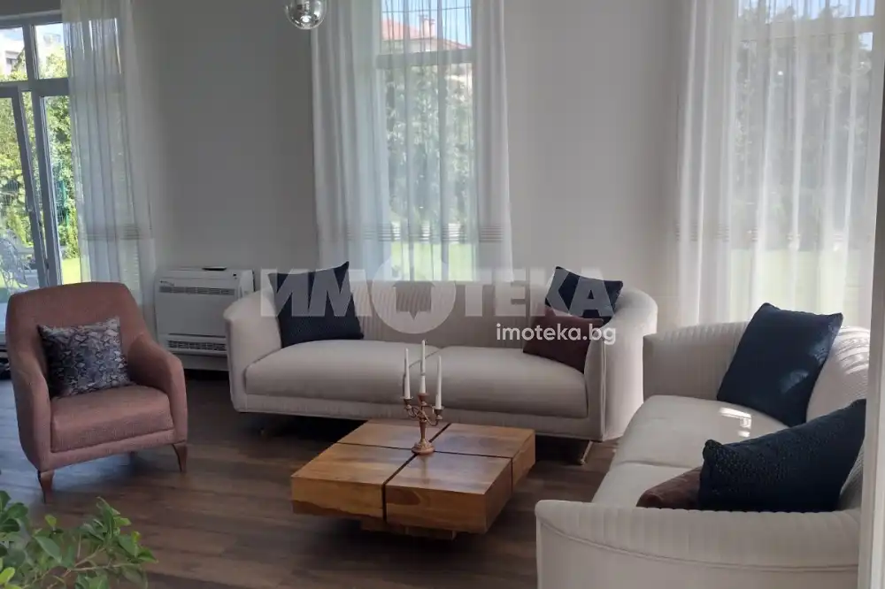 1-ви етаж: Просторен и светъл дневен тракт с височина на тавана от 3.0 м и френска камина с въздуховоди към втори етаж,модерна кухня, трапезария и холова част с мека мебел, тоалетна, гардеробно-техническо помещение и вътрешно стълбище .