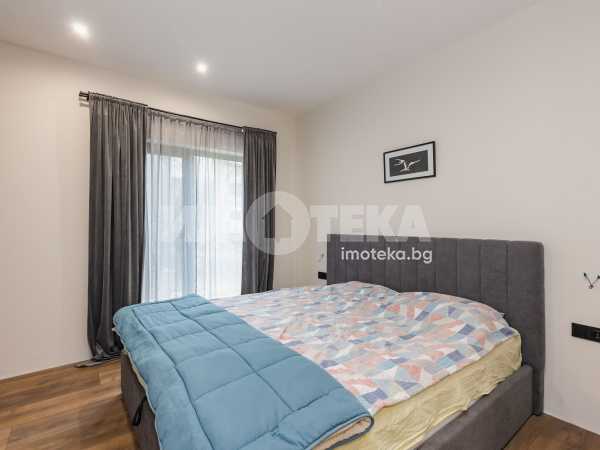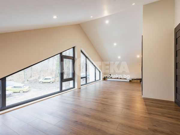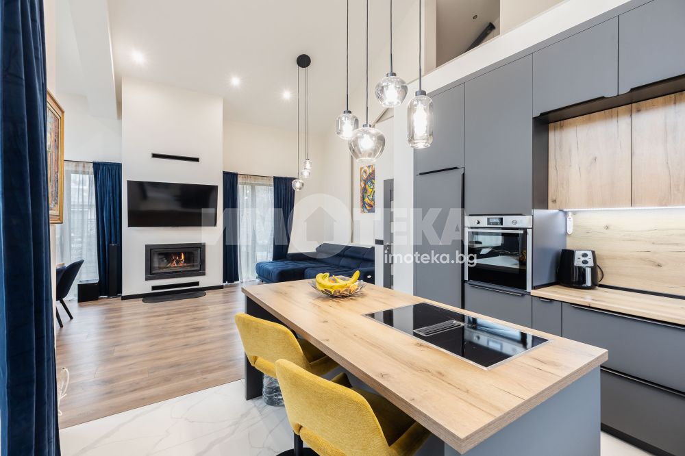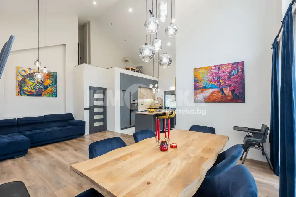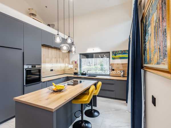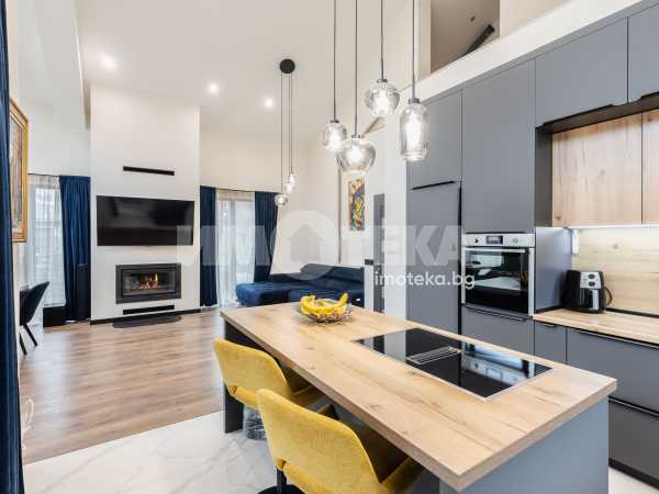 Състои се от голяма слънчева дневна с високи тавани, излаз на веранда към двора, камина с въздуховод, оборудвана кухня, две спални, една от които с дрешник, баня с тоалетна с подово отопление и перално помещение.