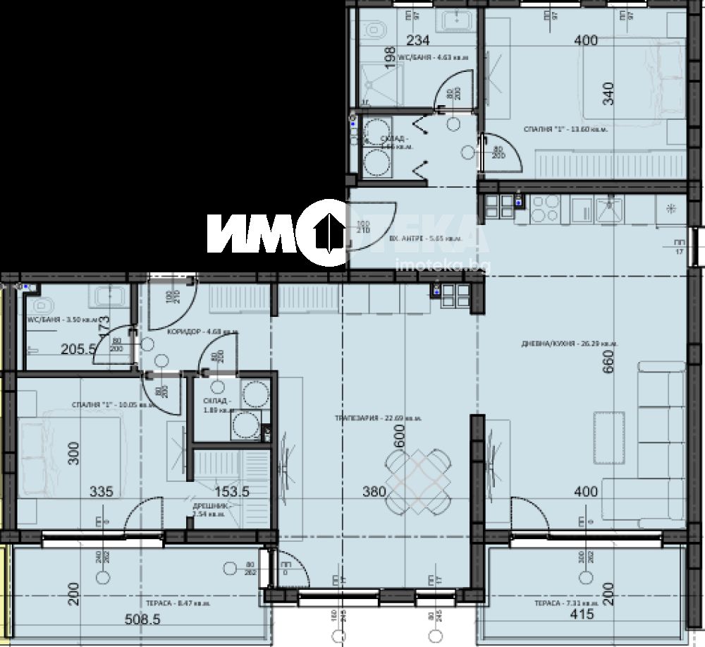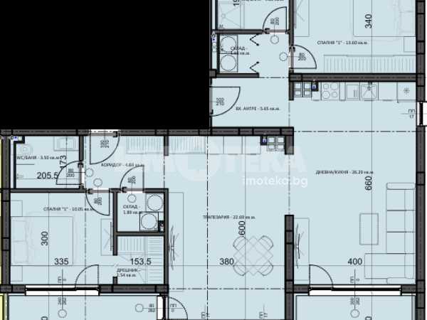 В продажба апартамент с четири самостоятелни стаи в м-ст Ален Мак. Жилището се намира на първи етаж над бизнес помещения. Площта на имота е 153 кв.м. Състои се от две спални, едната със собствен дрешник, две бани с тоалетни, две складови помещения, кухня с трапезария и отделно хол, две тераси. Степен на завършеност "БДС".
