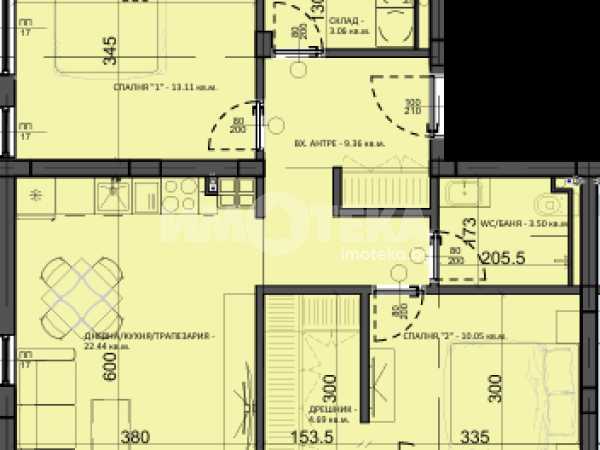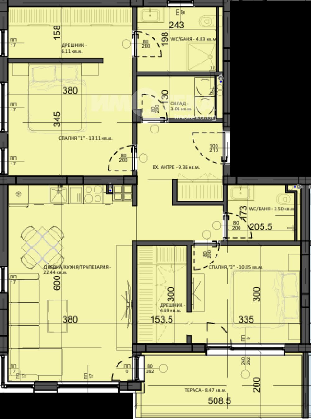 В продажба тристаен апартамент в района на м-ст Ален Мак. Жилището се намира на втори етаж, с площ от 117 кв.м. Състои се от две спални, едната със собствен дрешник и комбиниран санитарен възел, втори дрешник за втората спалня, склад, втори комбиниран санитарен възел, дневен тракт и прекрасна тераса. Жилището ще бъде завършено по БДС.