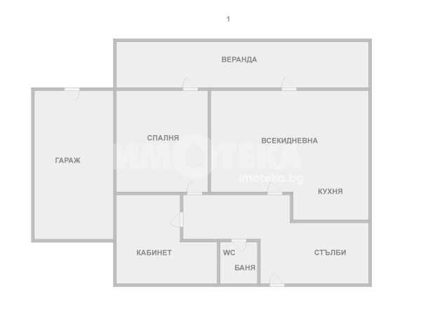 Етаж първи: голяма дневна с кухня и трапезария, една спалня, килер, баня с тоалетна, гараж за голям автомобил.