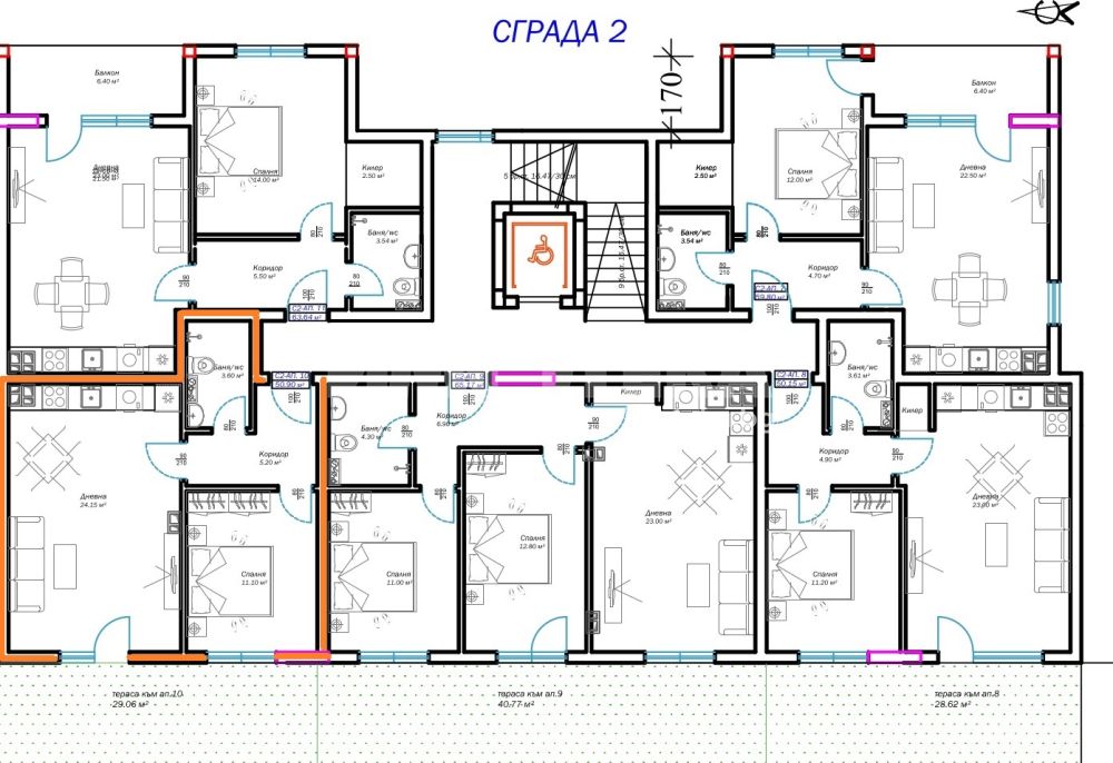 Двустаен апартамент с площ 102 кв.м., състоящ се от дневен тракт с кухненски бокс, спалня, коридор, тераса, баня с тоалетна. Апартаментът ще бъде завършен по БДС.