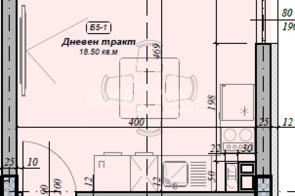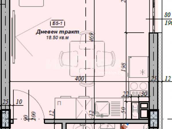 Двустаен апартамент, разположен на среден етаж, състоящ се от всекидневна, спалня, баня и тоалет, тераса, коридор.