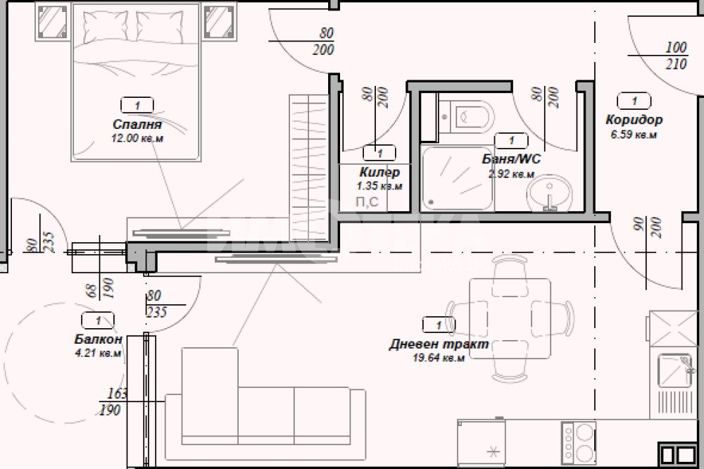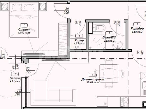 Двустаен апартамент, разположен на среден етаж, състоящ се от всекидневна, спалня, килер, баня и тоалет, тераса, коридор.