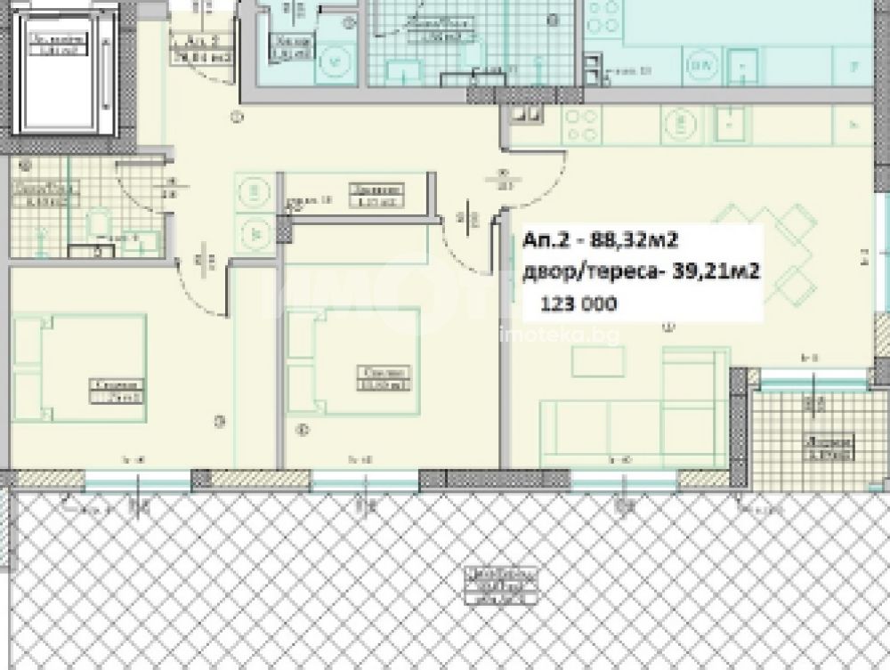 Тристаен апартамент в м-ст Пчелина. Жилището е разположено на партерен етаж, с площ от 88 кв.м., Състои се от две спални, дневен тракт, баня с тоалетна, 40 кв.м. двор. Към жилището има избено помещение. Степен на завършеност БДС.