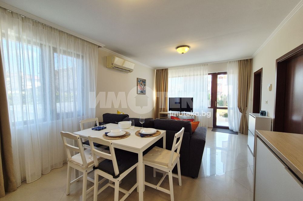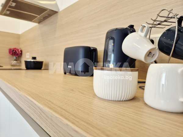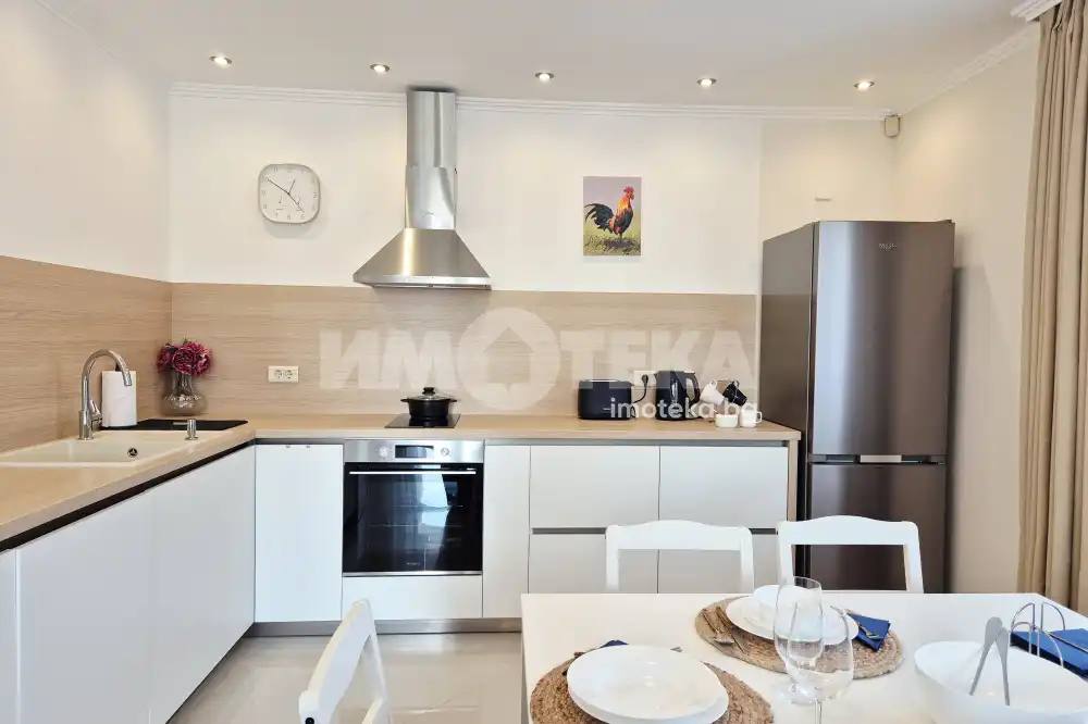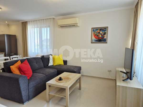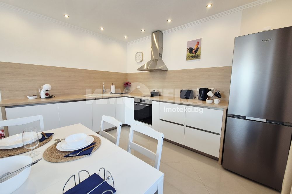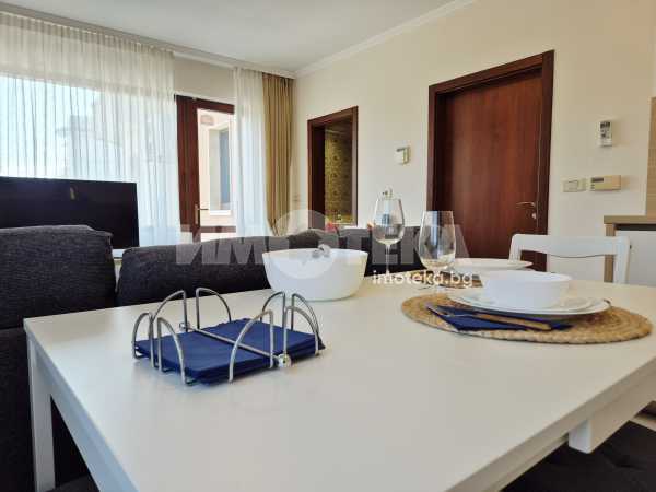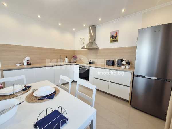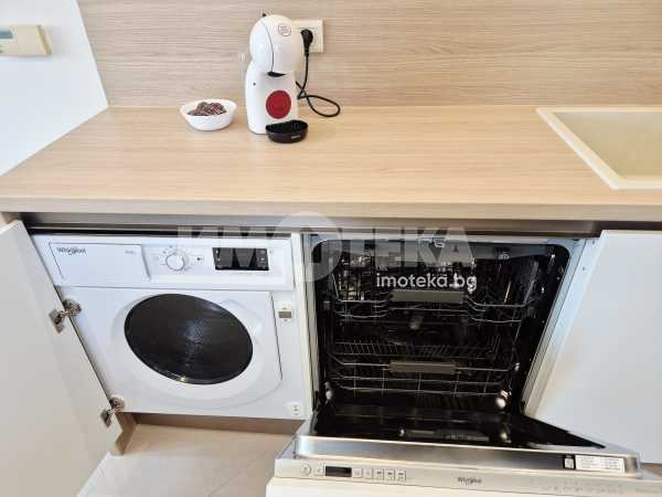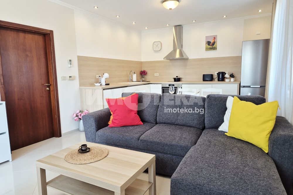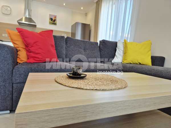 Представяме Ви нов, уютно обзаведен апартамент с една спалня. Жилището представлява част от семейна къща, като разполага с отделен вход. Директно се влиза в кокетна дневна с кухненска част (бяла техника, вкл. съдомиялна, пералнята е комбинирана със сушилня, мека мебел, телевизор), баня с тоалет. Спалня с голямо легло, гардероби и собствена баня с тоалет. Отопление - два климатика. Малка веранда пред жилището и възможност за ползване на барбекю.