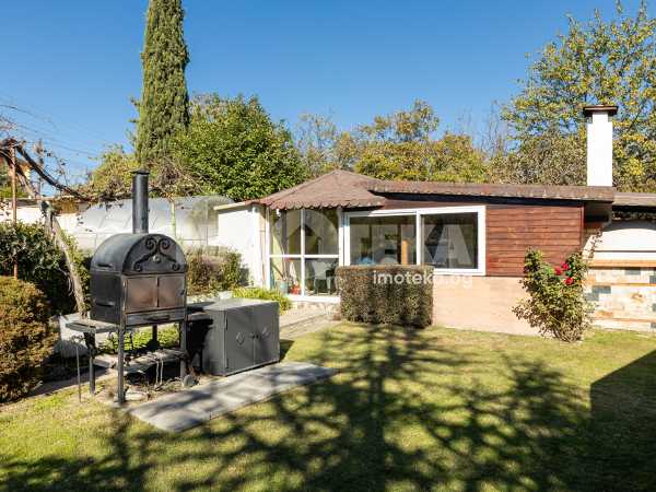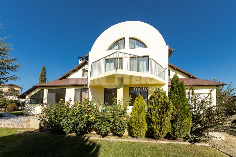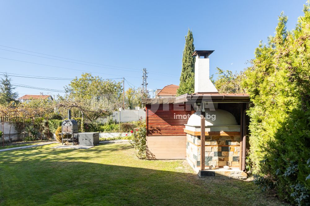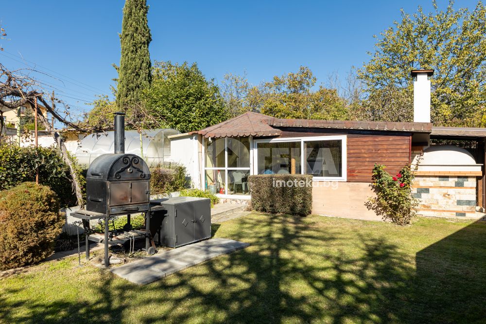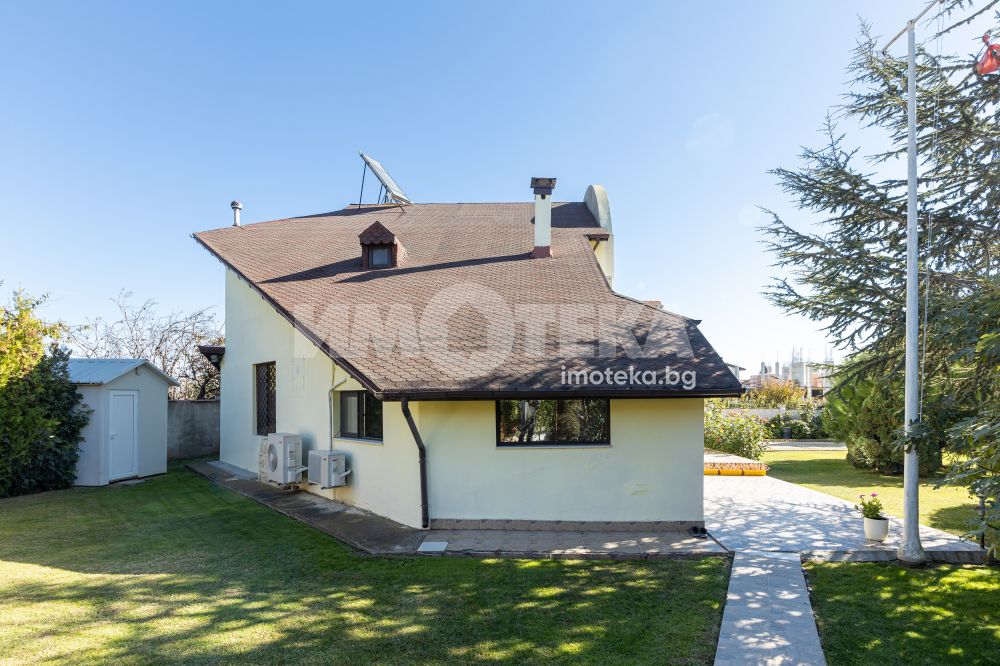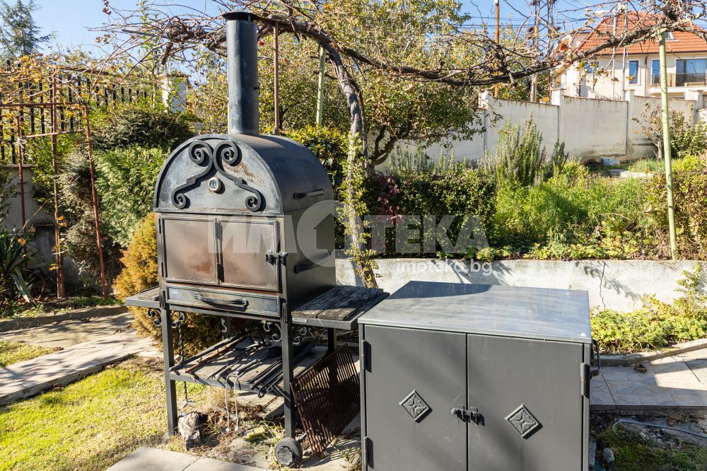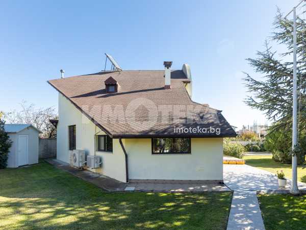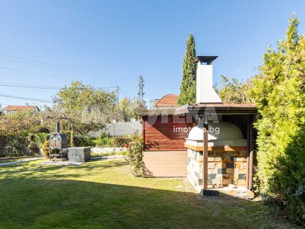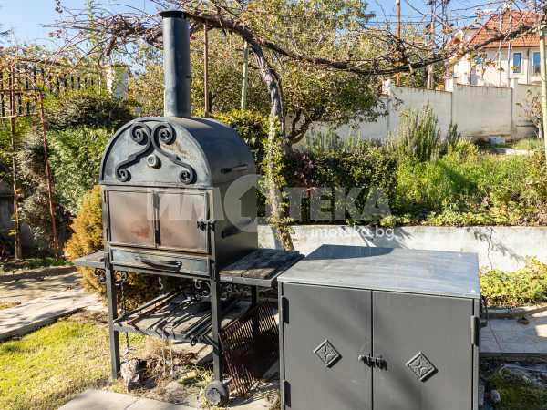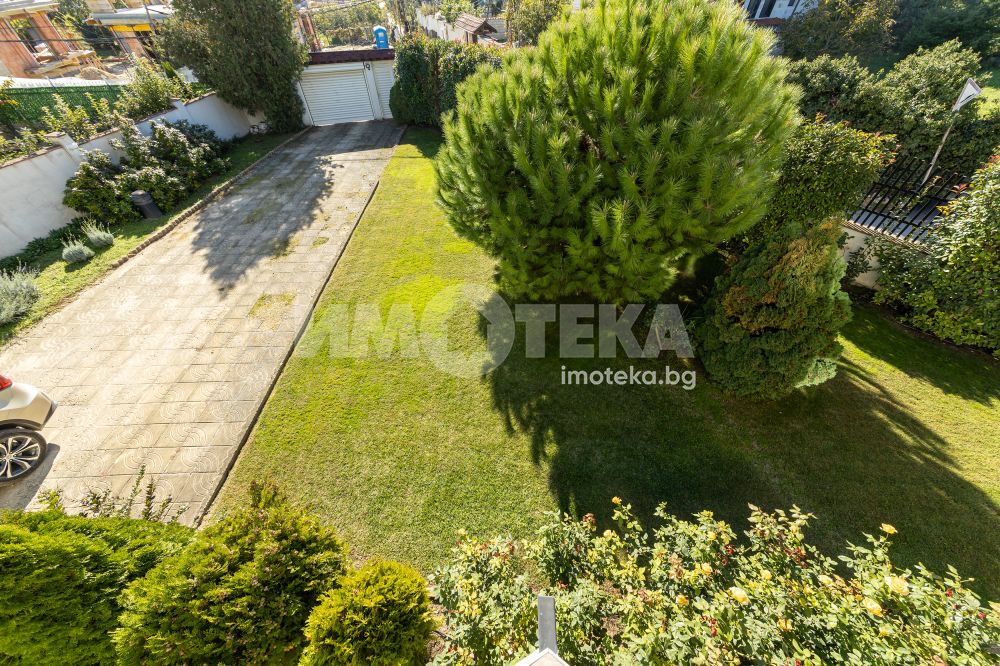 Просторен двор, добре поддържан , богато озеленен с уникална декоративна растителност, ,идеален за отих и развлечния на открито. Барбекю зона , зимна градина от 23 кв м , самостоятелен гараж и пармоместа за 5 автомобила