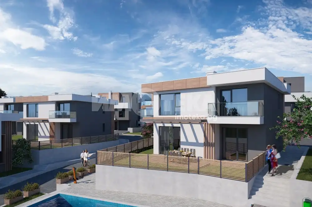 АДРЕС предлага на Вашето внимание двуетажна къща с РЗП 217 кв.м. и дворно място от 354,58 кв.м. в новостроящ се затворен комплекс.