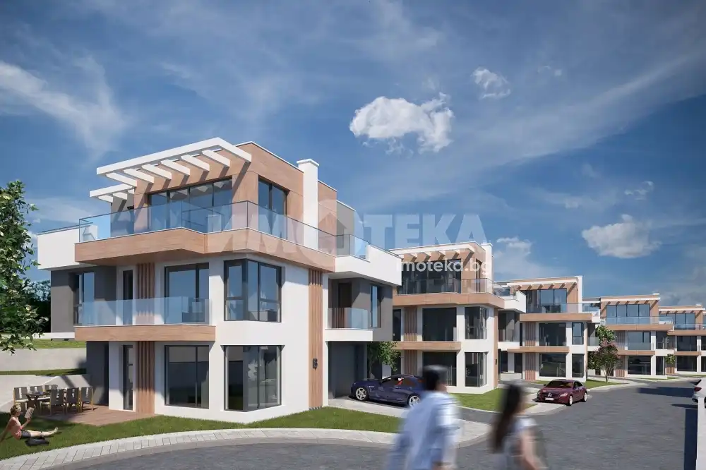 АДРЕС предлага на вашето внимание прекрасна триетажна къща, която е част от затворен комплекс в местност Горна Трака, състоящ се от шест двуетажни и десет триетажни къщи, разположени в богато озеленен парцел в тих и спокоен район.