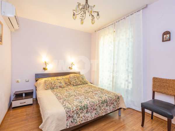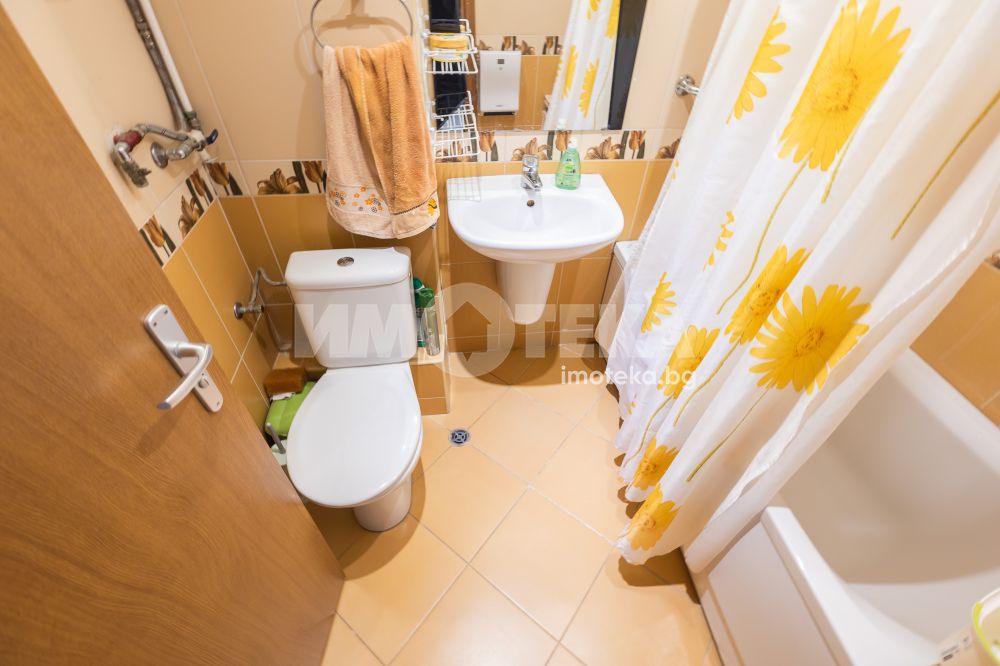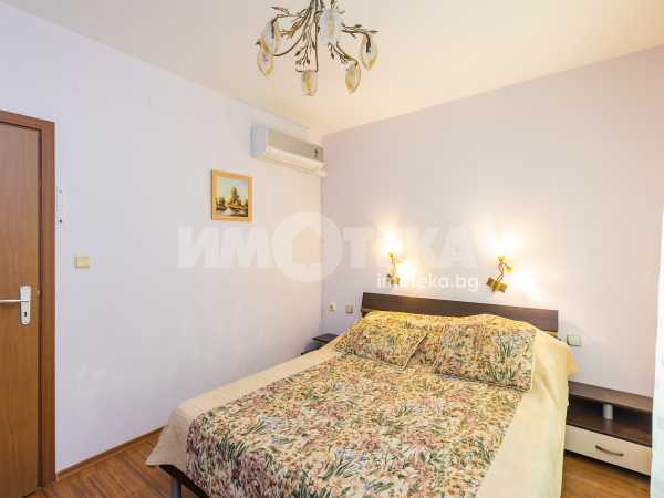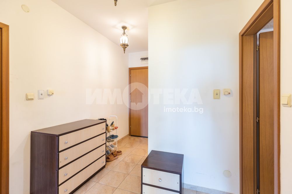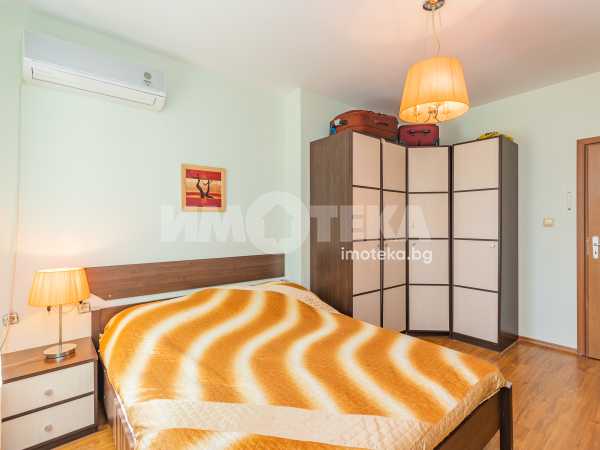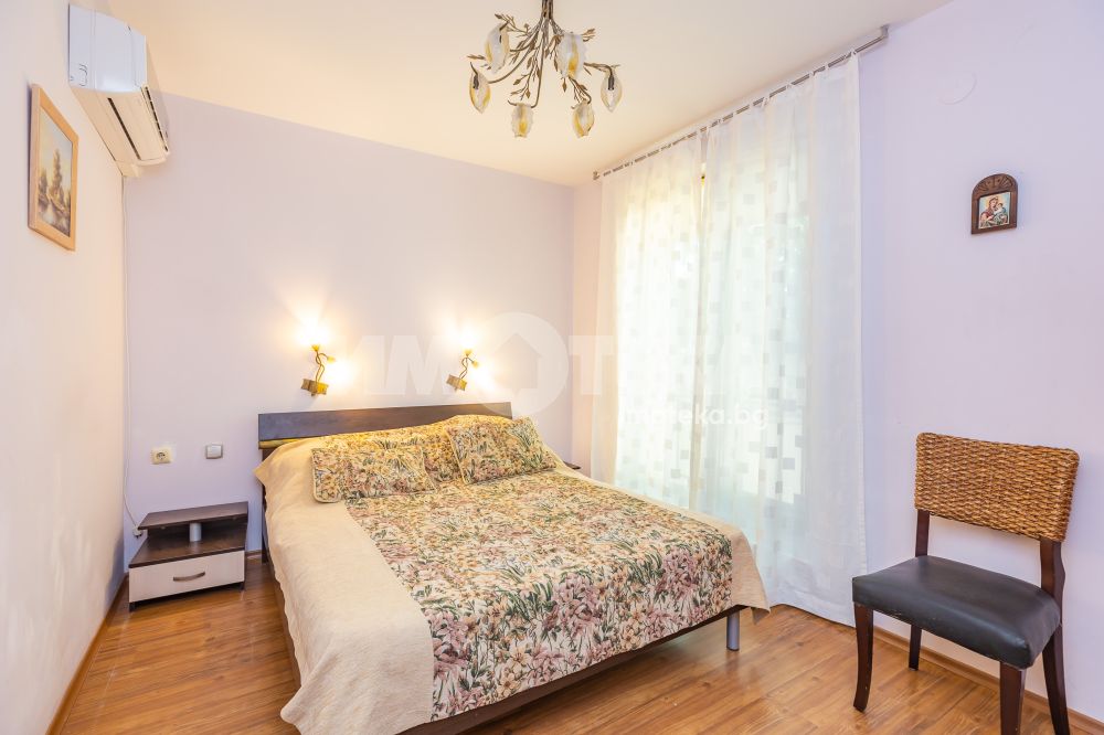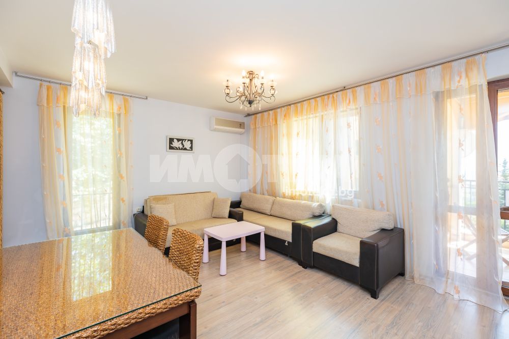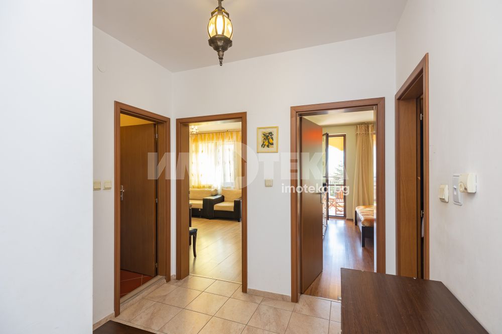 Тристаен обзаведен апартамент на среден етаж с южно изложение и морска гледка. Имотът се състои от коридор, две спални, всекидневна с кухненски бокс, баня тоалет, отделно тоалет, перално помещение и тераса. Към него има и мазе, както и възможност за покупка на гараж с цена 20 000 €.