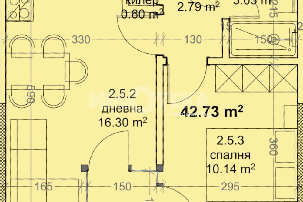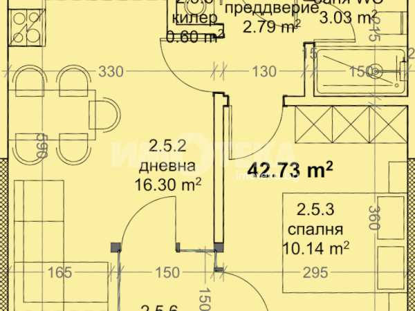 Апартаментът е с функционално разпределение и обща площ от 52 кв.м, състоящо се от: