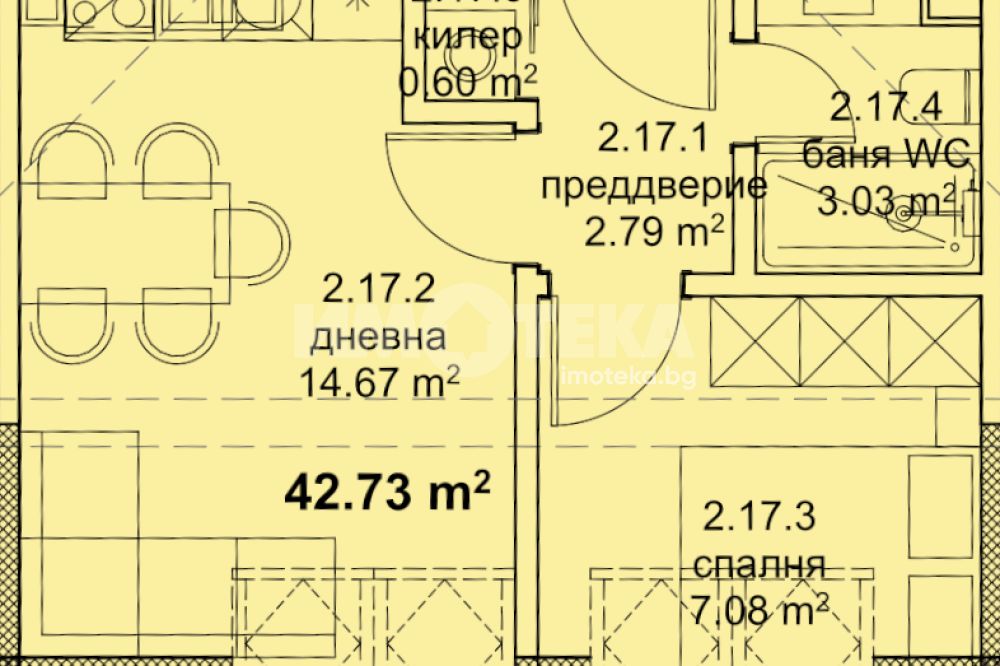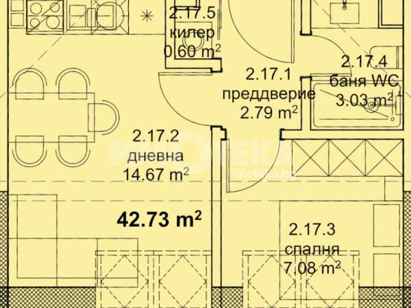 Апартаментът е с функционално разпределение и обща площ от 52 кв.м, състоящо се от: