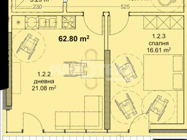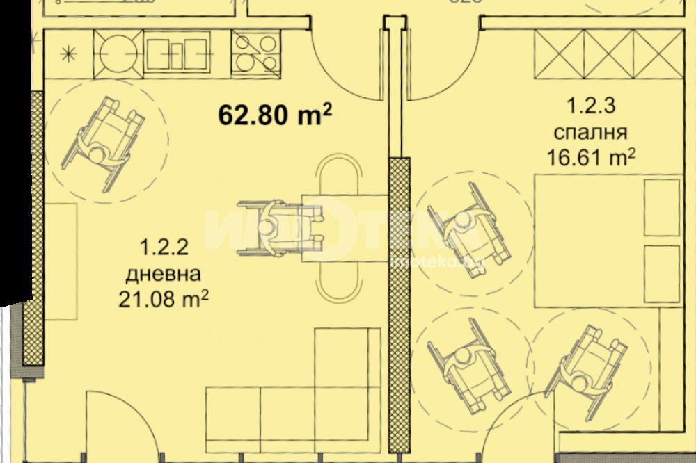 Апартаментът е с обща площ от 76 кв.м + 12м2 двор и се състои от: